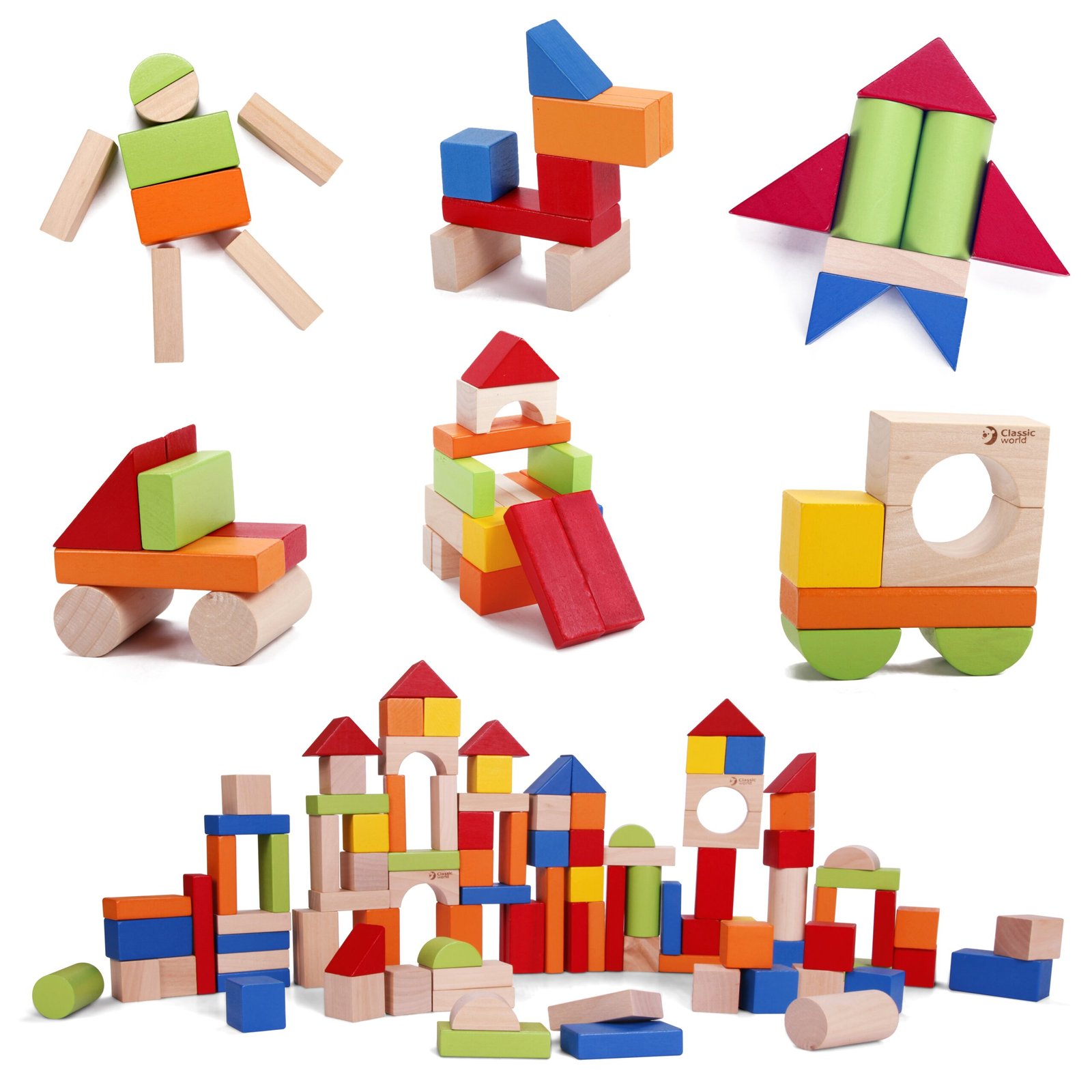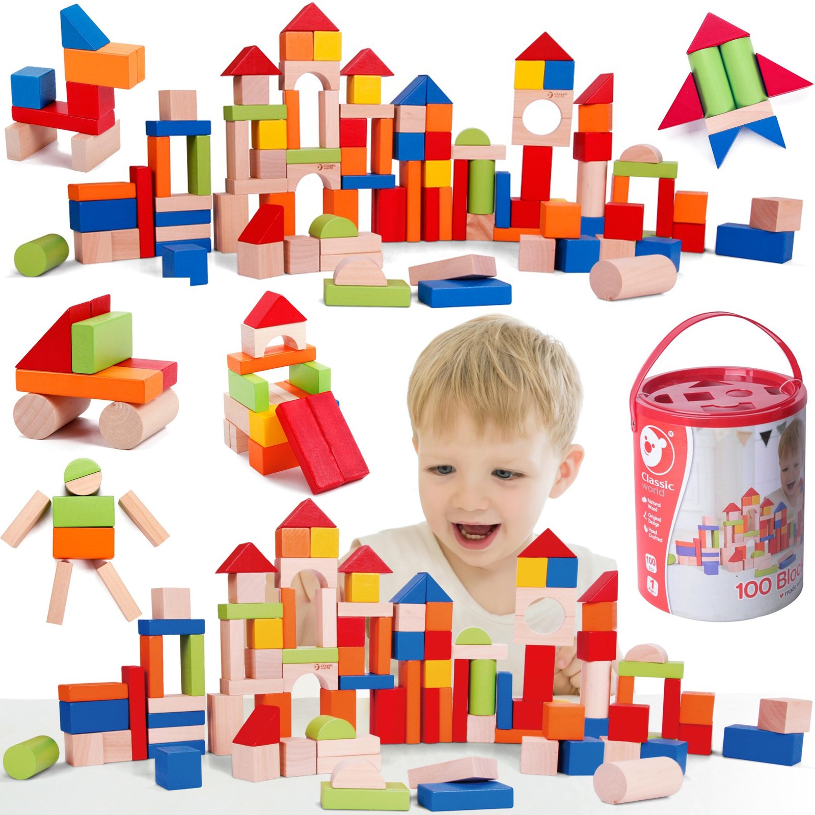 Šis „Classic World“ 100 medinių kaladėlių rinkinys – puikus pasirinkimas mažiesiems statytojams. Šios kaladėlės suteiks daug pramogų ir lavinamosios veiklos. Jos padeda lavinti smulkiąją motoriką, erdvinę vaizduotę ir ugdyti gebėjimą kurti pirmąsias konstrukcijas. Kaladėlės sukurtos atsižvelgiant į mažas vaiko rankytes, neturi aštrių kraštų, todėl yra visiškai saugios mažyliams.