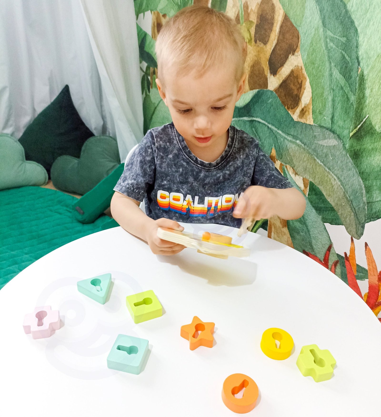 Spalvingos ir įvairių formų kaladėlės ne tik lavina rankų-akių koordinaciją, bet ir padeda išmokti geometrines figūras. Be to, žaidimas su virvelėmis, raktu ir durelėmis reikalauja susikaupimo ir kantrybės, o tai yra svarbios savybės, formuojančios vaiko gebėjimą koncentruotis ir spręsti problemas.