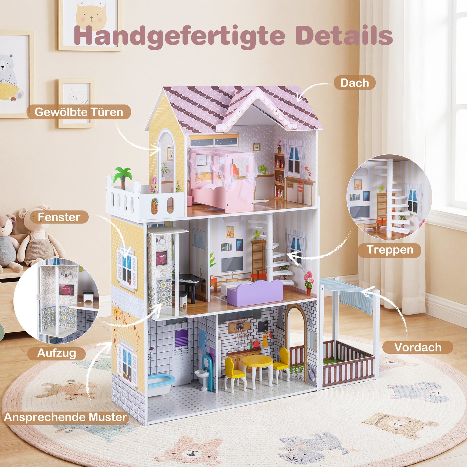 Šis medinis lėlių namelis pasižymi detaliu ir patraukliu trijų aukštų dizainu, idealiai tinkančiu vaikams nuo 3 metų tyrinėti kūrybiškus vaidmenų žaidimus. Atviro išplanavimo namelyje gausu kambarių: miegamasis, balkonas, fortepijono kambarys, svetainė, vonios kambarys, virtuvė ir net sodas, suteikiantys platų scenarijų spektrą išradingoms istorijoms ir vaidmenų žaidimams. Be to, komplekte yra baldai ir aksesuarai, leidžiantys vaikams patiems kurti unikalias šeimos istorijas.