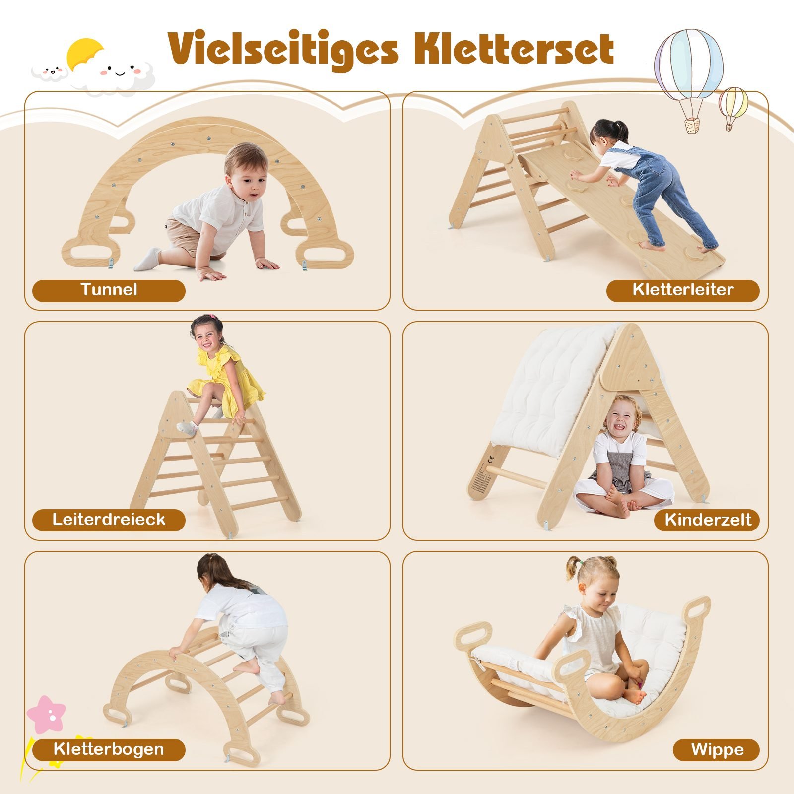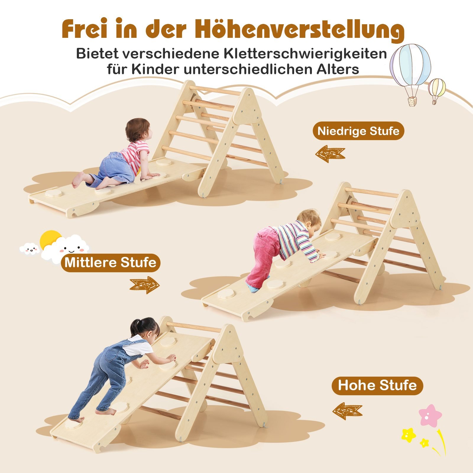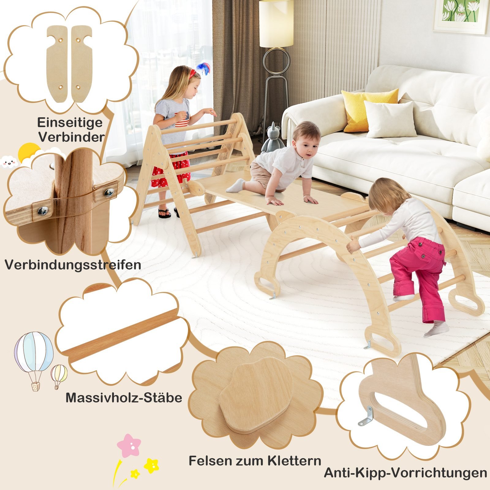 Suteikite vaikams daug smagumo su šiuo mediniu 4-in-1 laipiojimo rinkiniu! Komplekte yra laipiojimo trikampis, laipiojimo lankas ir čiuožykla, kurie užtikrins begalinį džiaugsmą ir pramogas.