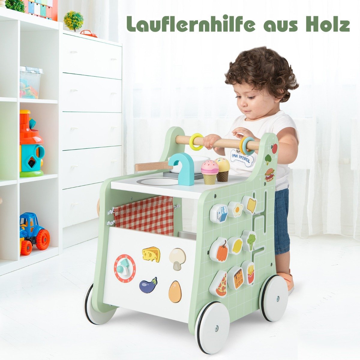 Medinis 6-in-1 lavinimo vežimėlis su virtuvėle ir mokomuoju laikrodžiu (Žalia)