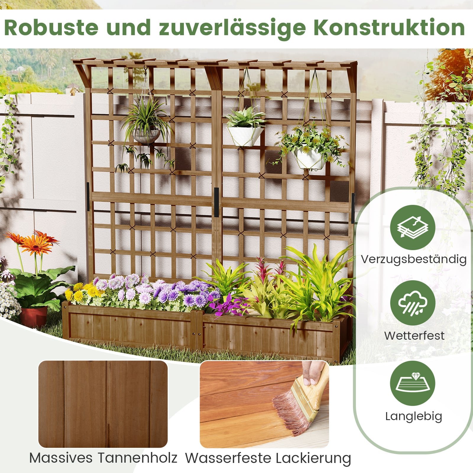 • Patvari eglės medienos konstrukcija, atspari oro sąlygoms ir skilimui, padengta vandens pagrindo dažais.