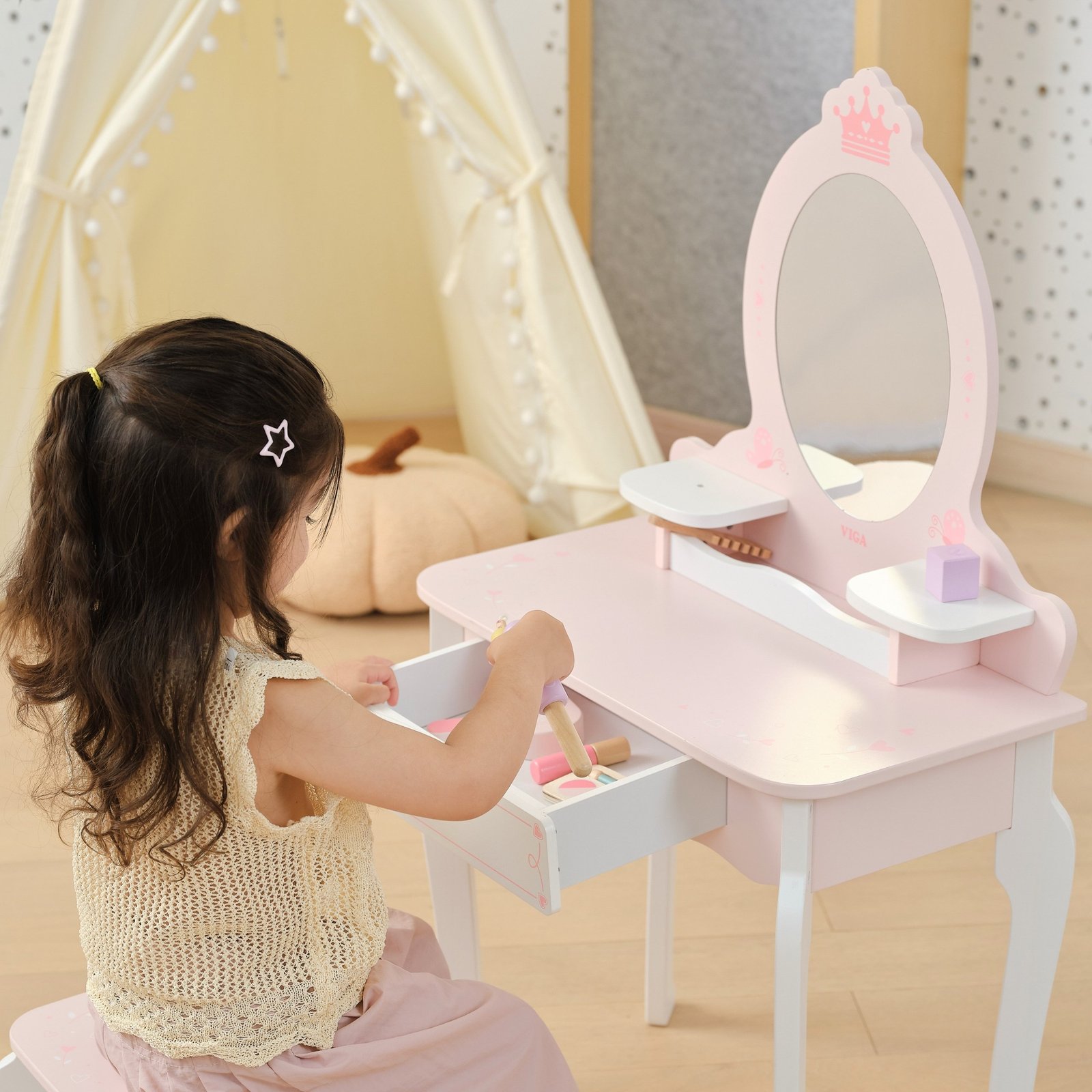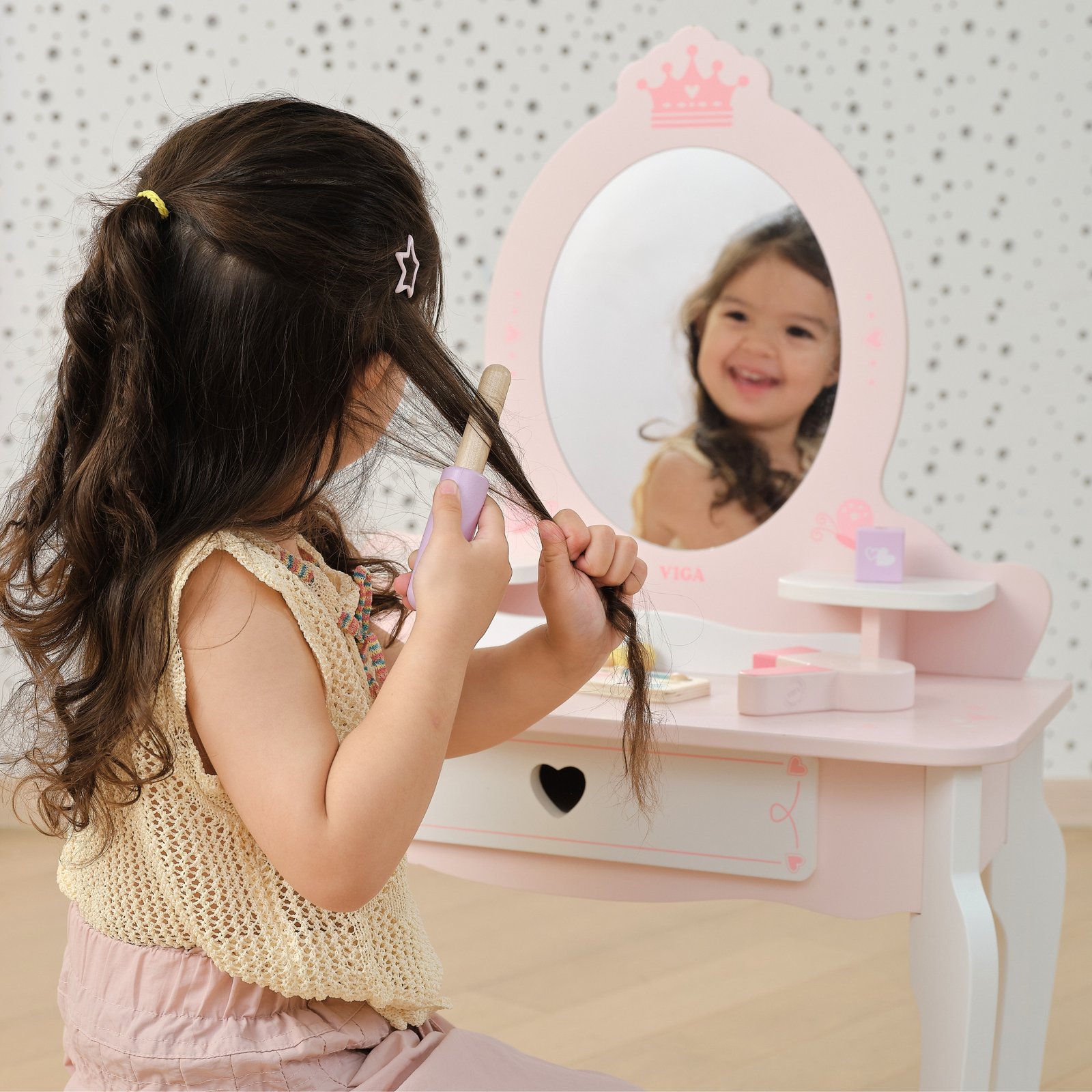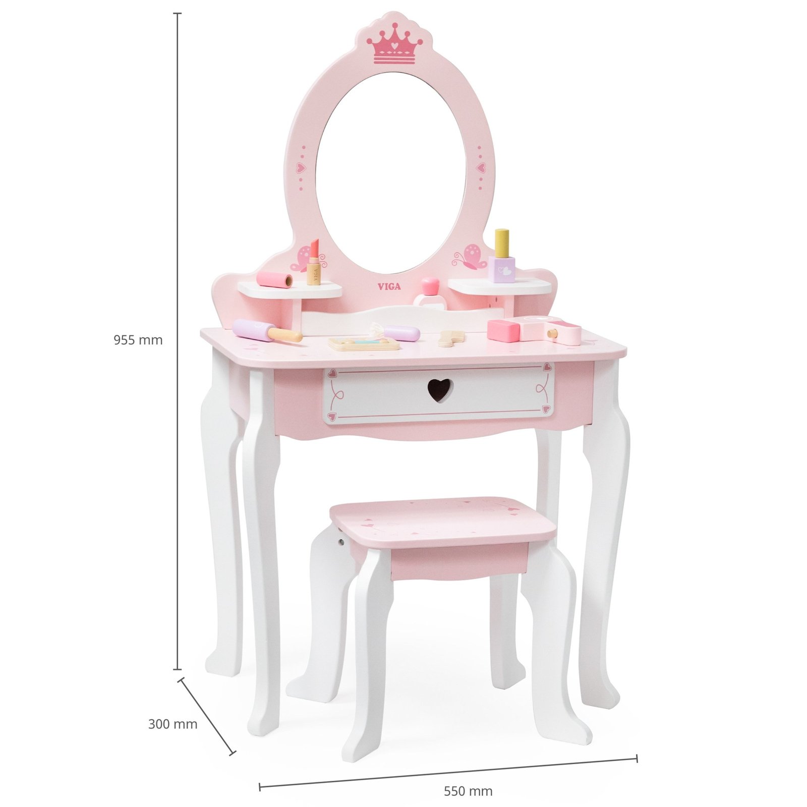 Šis didelis medinis tualetinis staliukas – puikus pasirinkimas mažajai princesei. Pagamintas iš aukščiausios kokybės medienos, švelnių rožinės ir baltos spalvų atspalvių, jis išsiskiria pasakišku dizainu. Stilingos, užapvalintos formos, subtilūs papuošimai ir elegantiškos kojelės leidžia staliukui puikiai įsilieti į vaikų kambario interjerą, suteikiant jam žavesio ir jaukumo. Šis staliukas ne tik lavina kūrybiškumą ir vaizduotę, bet ir skatina žaisti vaidmeninius žaidimus. Dėl tvirtos konstrukcijos ir estetiškos išvaizdos, tai puiki dovana, kuri džiugins ilgus metus.