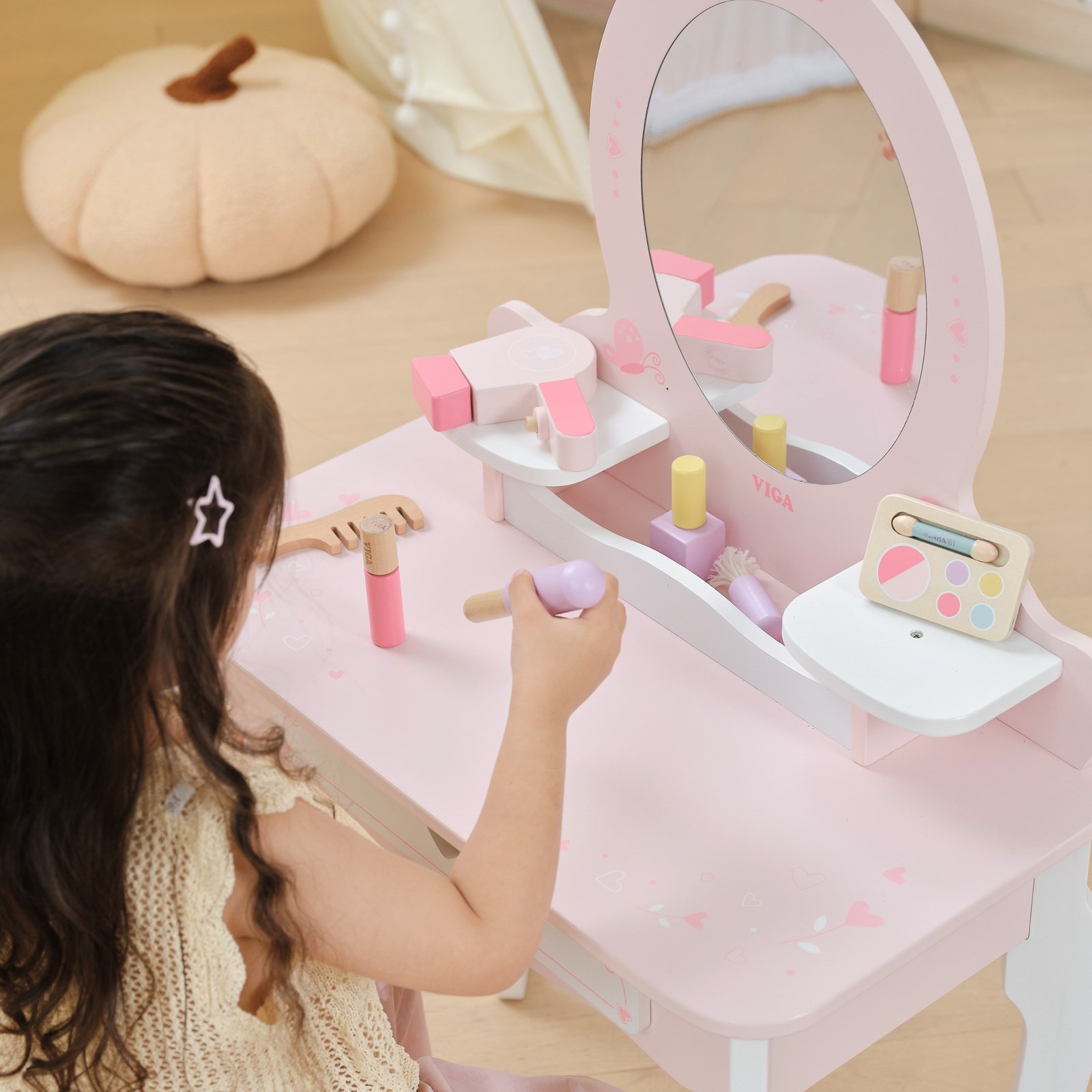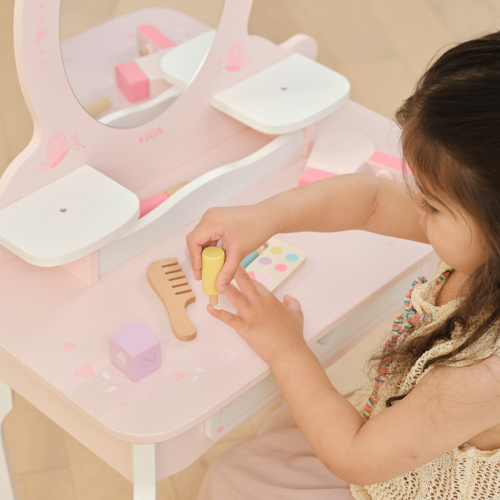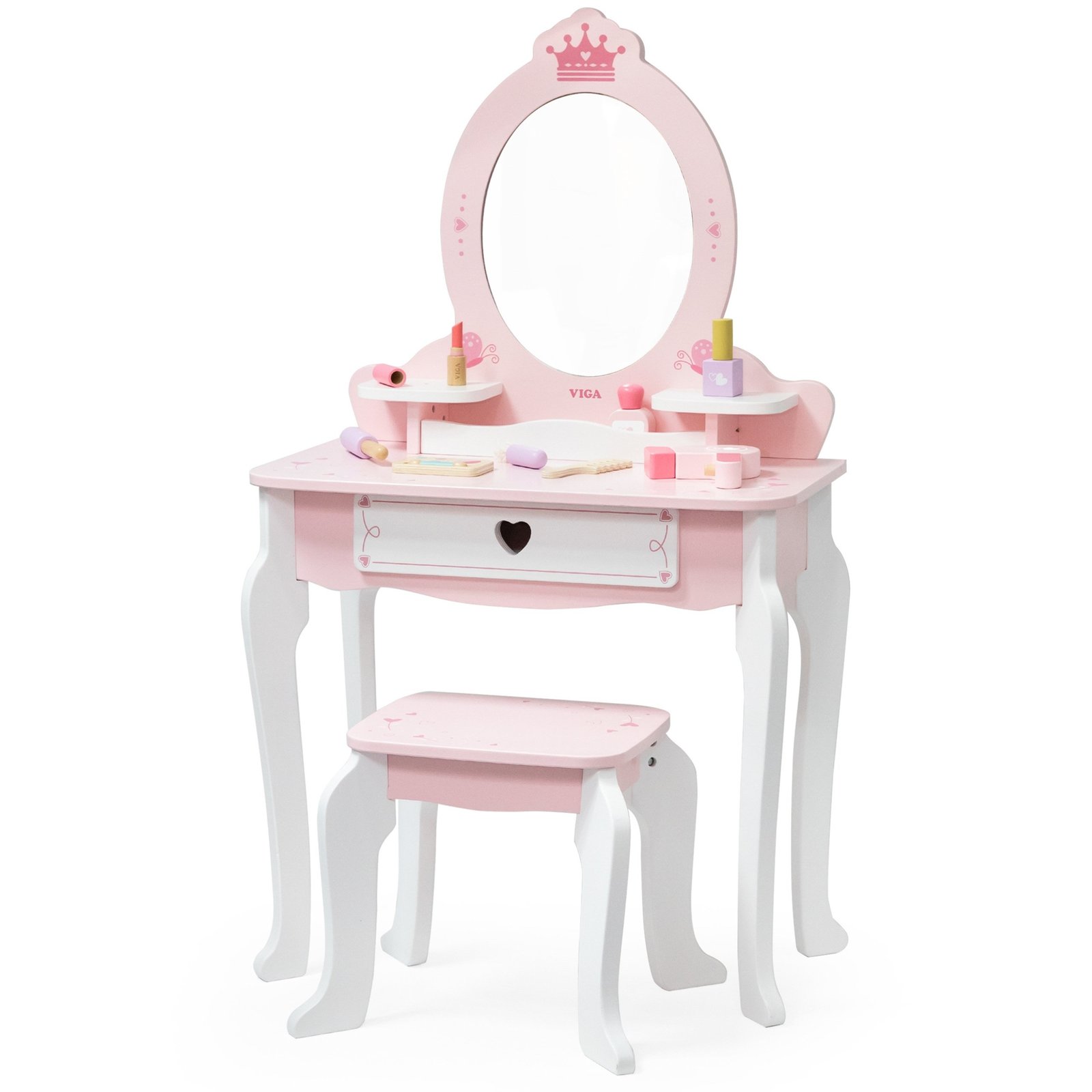 Šis didelis medinis tualetinis staliukas – puikus pasirinkimas mažajai princesei. Pagamintas iš aukščiausios kokybės medienos, švelnių rožinės ir baltos spalvų atspalvių, jis išsiskiria pasakišku dizainu. Stilingos, užapvalintos formos, subtilūs papuošimai ir elegantiškos kojelės leidžia staliukui puikiai įsilieti į vaikų kambario interjerą, suteikiant jam žavesio ir jaukumo. Šis staliukas ne tik lavina kūrybiškumą ir vaizduotę, bet ir skatina žaisti vaidmeninius žaidimus. Dėl tvirtos konstrukcijos ir estetiškos išvaizdos, tai puiki dovana, kuri džiugins ilgus metus.