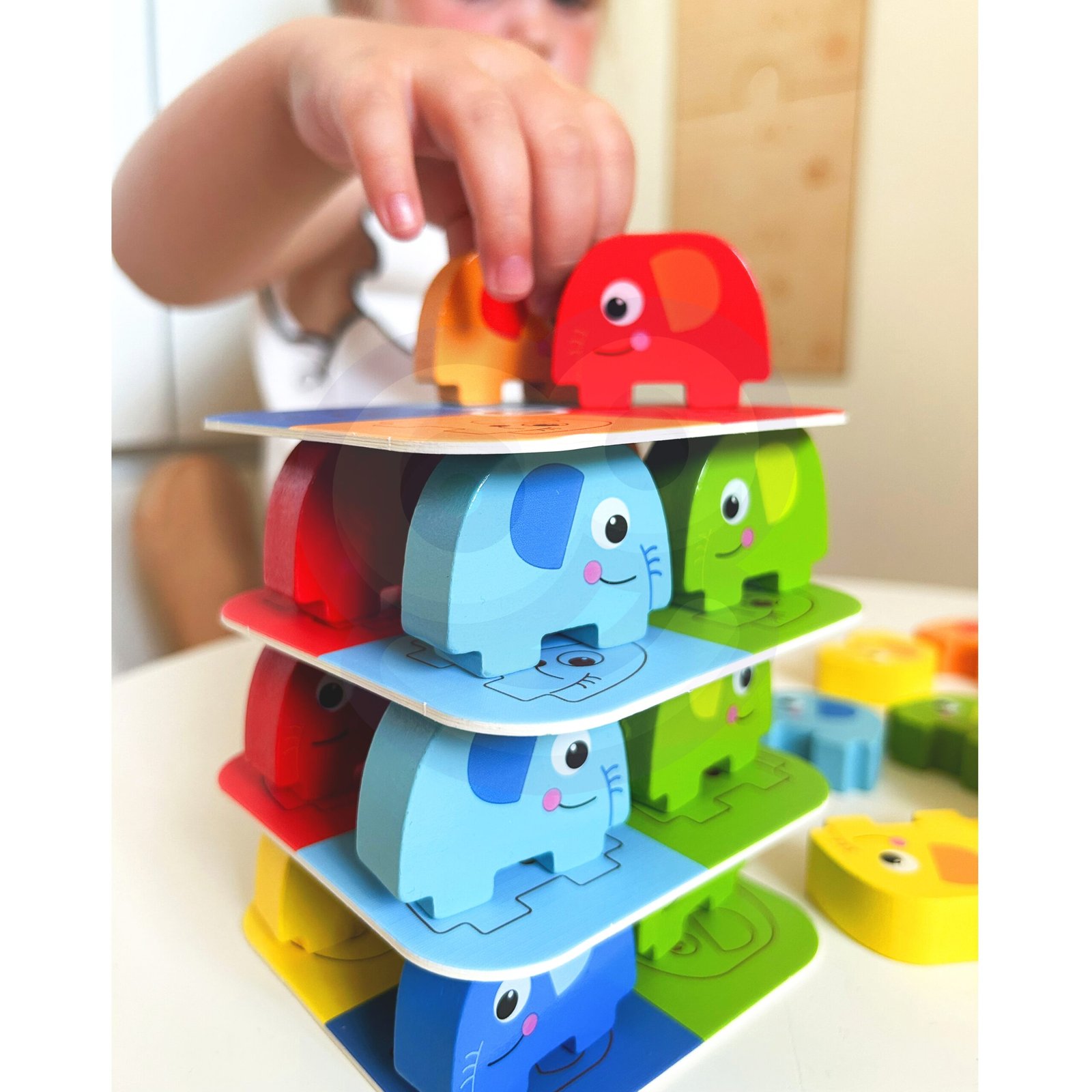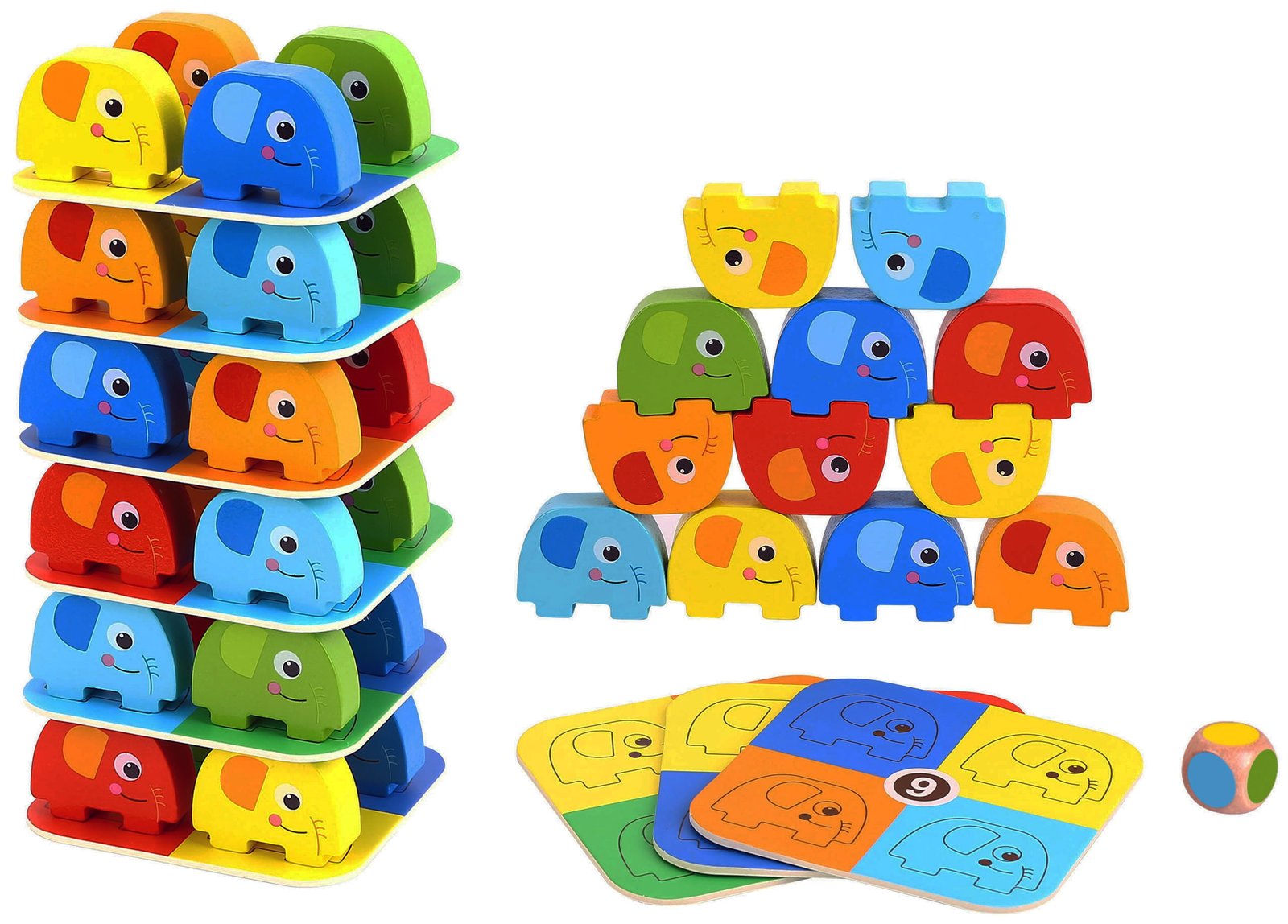 Žaidimas WOOPIE GREEN „Drambliukas ant drambliuko“ garantuoja smagią pramogą ir azartą! Rinkinį sudaro 46 spalvingi mediniai elementai, kauliukas ir kortelės, leidžiantys žaisti įvairiais būdais: tiek statyti drambliukų bokštą, tiek žaisti vikrumo žaidimą „Jengos“ stiliumi. Ryškios spalvos ir patrauklus dizainas patraukia vaikų dėmesį, o suapvalintos formos užtikrina saugumą vaikams nuo 3 metų amžiaus.