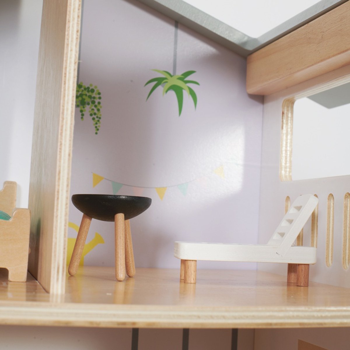 Pagamintas iš kokybiškos medienos, be aštrių kraštų, ir nudažytas netoksiškais dažais, užtikrinančiais visišką vaiko saugumą. Komplekte rasite gausybę baldelių, leidžiančių vaikui kūrybiškai ir pagal savo skonį įrengti kiekvieną namelio kambarį. Tarp jų – funkcionali sofa, miegamojo veidrodis ir kiti priedai.