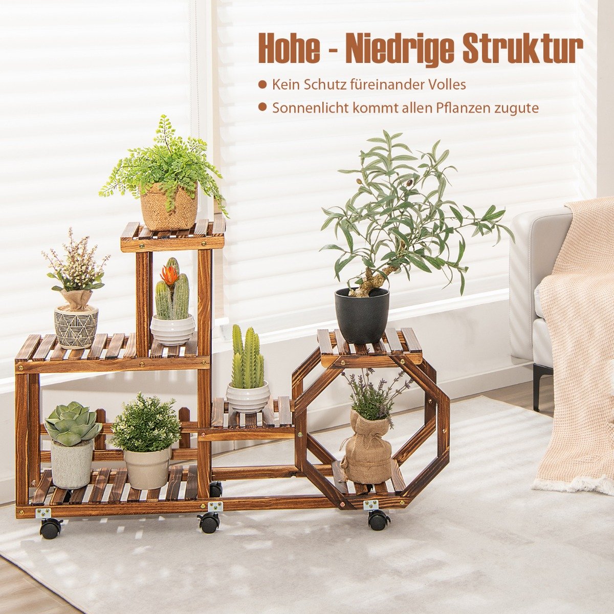 Medinis gėlių stovas su šešiomis lentynomis ir ratukais (Natūrali)
