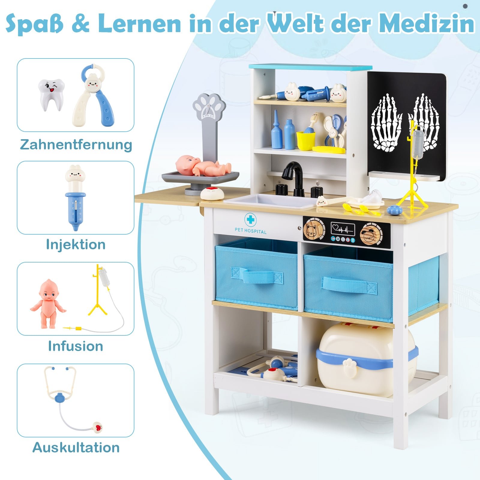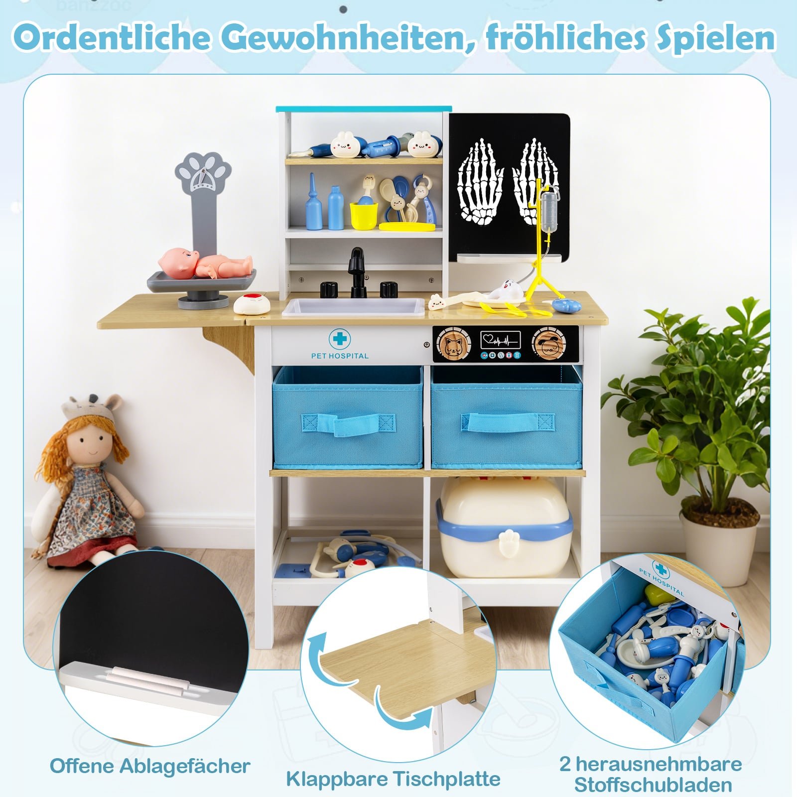 Šis medinis gydytojo žaidimų rinkinys vaikams atveria įtraukiantį ir interaktyvų medicinos pasaulį, puikiai lavinantį vaizduotę. Su rašomąja lentele, svarstyklėmis su linksmais gyvūnėlių personažais, tikroviška kriaukle su vandens čiaupu ir spragsinčiais mygtukais, jis skatina kūrybiškumą ir praktinį žaidimą. Patogūs daiktų laikymo sprendimai, tokie kaip atviros lentynos, tekstiliniai stalčiai ir sulankstomas stalviršis, padeda palaikyti tvarką ir ugdo organizuotumo įgūdžius.