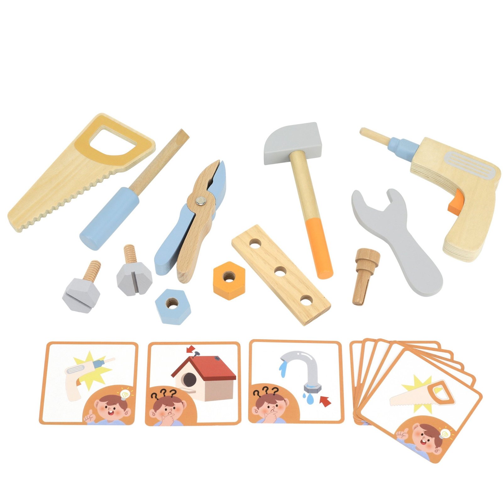 - Rinkinį sudaro 6 įrankiai, 6 priedai ir 8 kortelės.