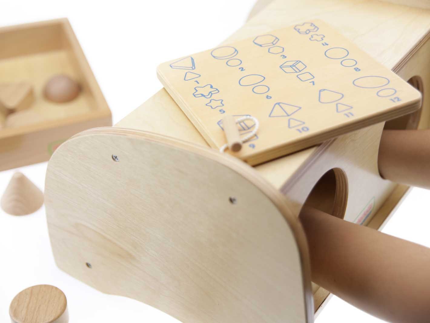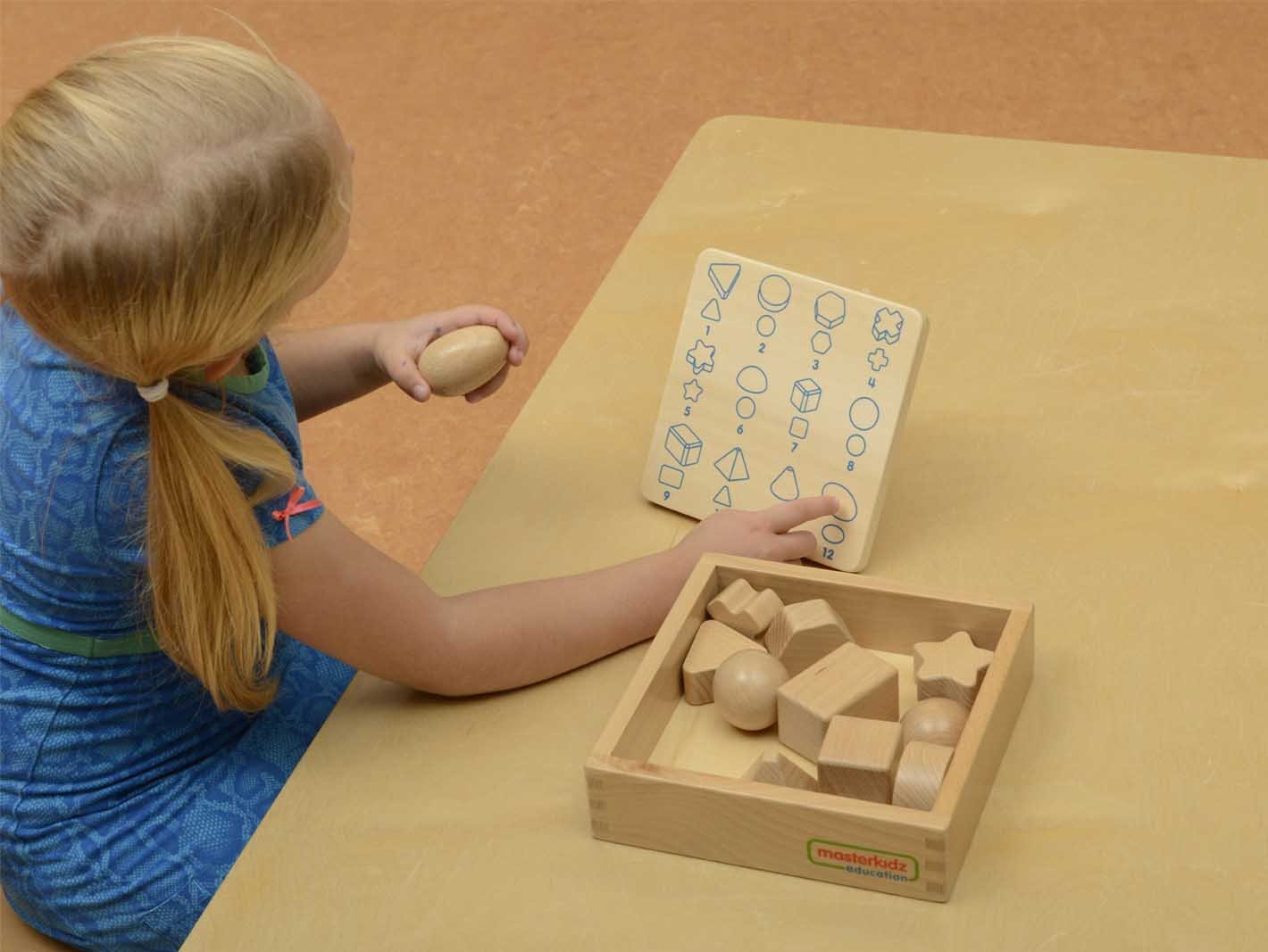 Šis medinis jutiminis rinkinys – tai lavinamasis žaislas, padedantis vaikams lavinti lytėjimo pojūtį ir įsiminti geometrines figūras. Rinkinį sudaro 12 medinių, įvairių geometrinių formų kaladėlių. Žaisdamas vaikas turi atspėti, kokią formą laiko rankoje, naudodamasis vien lytėjimu, nežiūrėdamas. Šis rinkinys padeda ugdyti formų atpažinimo gebėjimus ir skatina mokymąsi per žaidimą. Žaislas supakuotas į patogią medinę dėžutę, kuri palengvina jo laikymą. Šis rinkinys idealiai tinka naudoti kartu su žaidimo „Atspėk liesdamas“ dėžute.