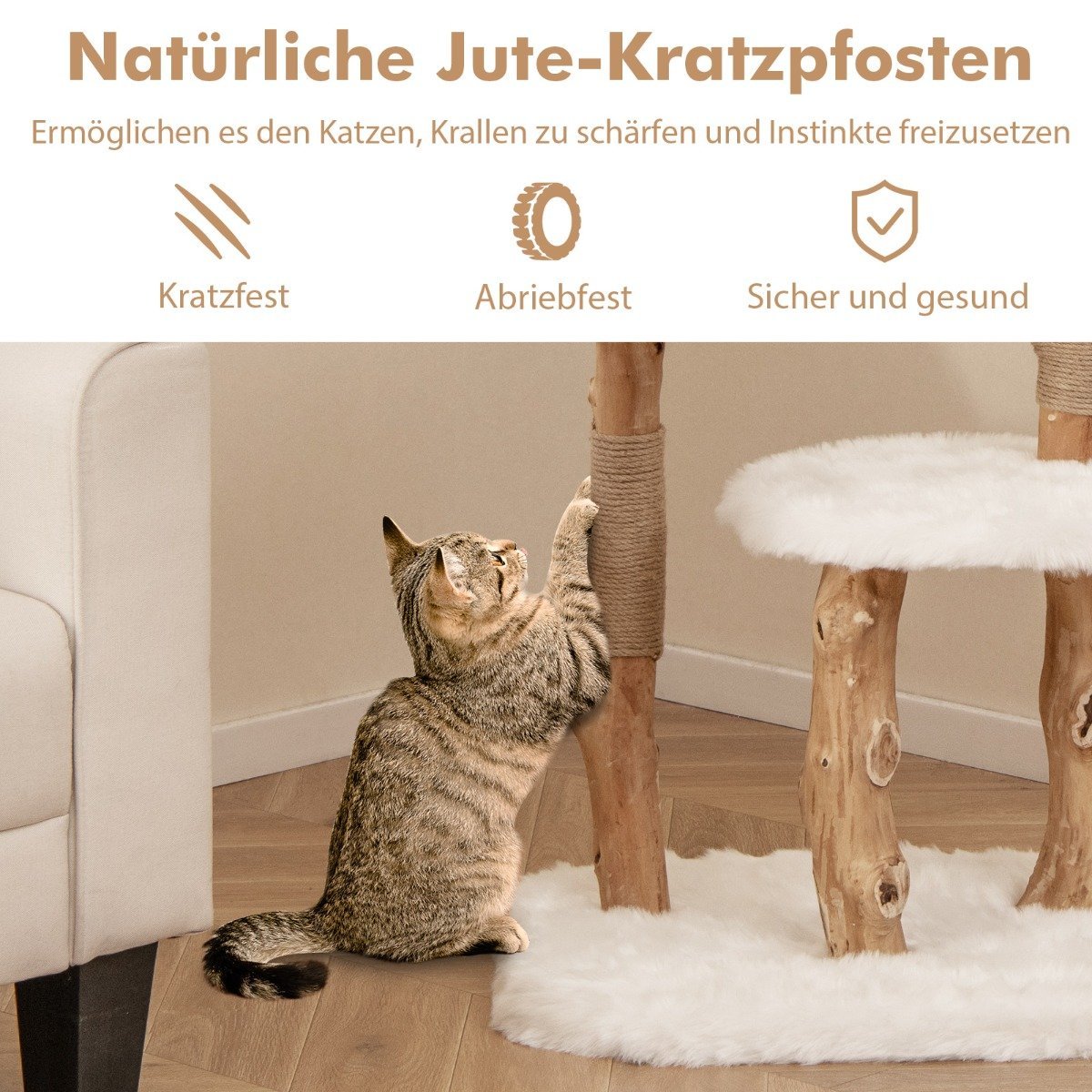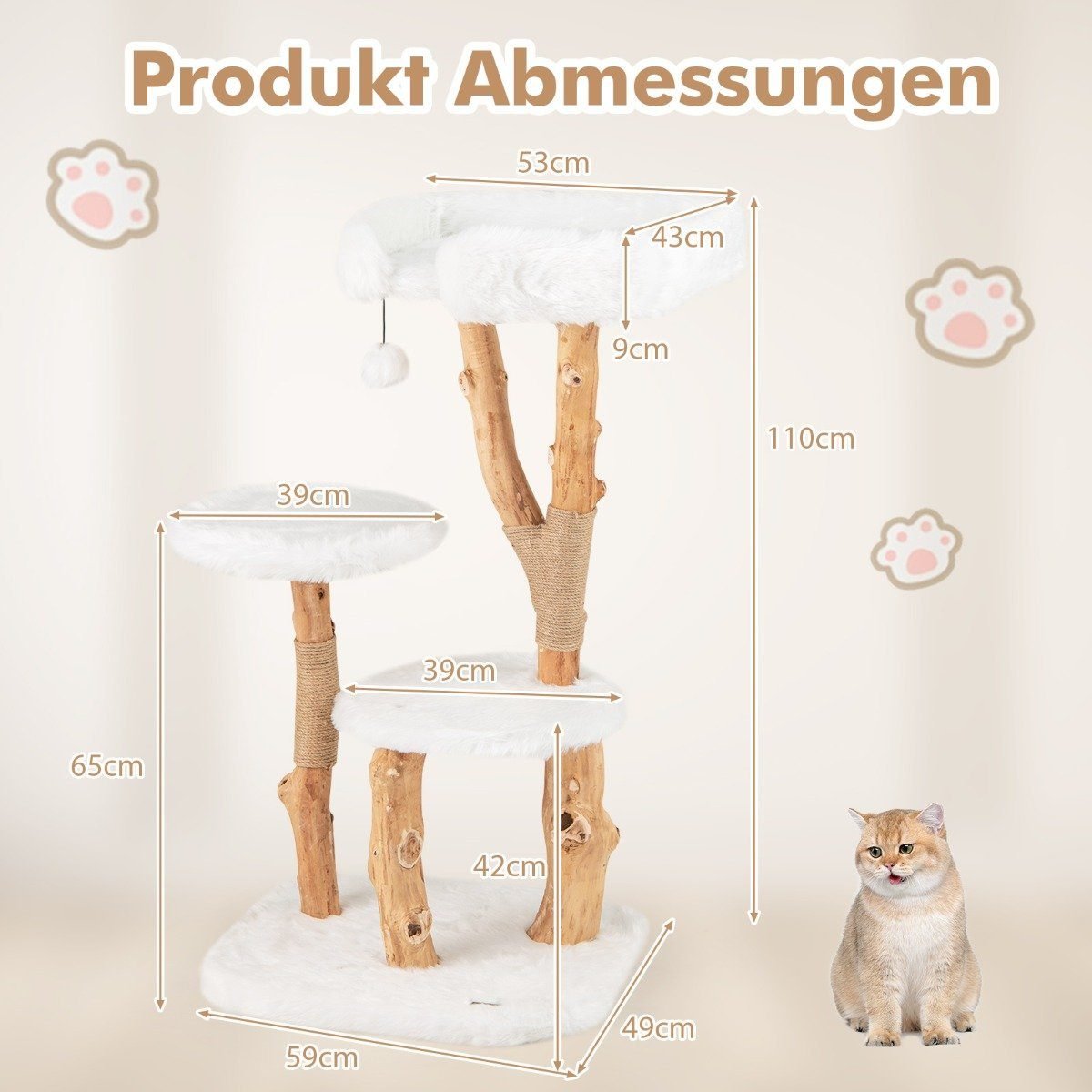 Medinis kačių draskyklinis namelis su dviem platformomis ir žaisliniu kamuoliuku (Balta)