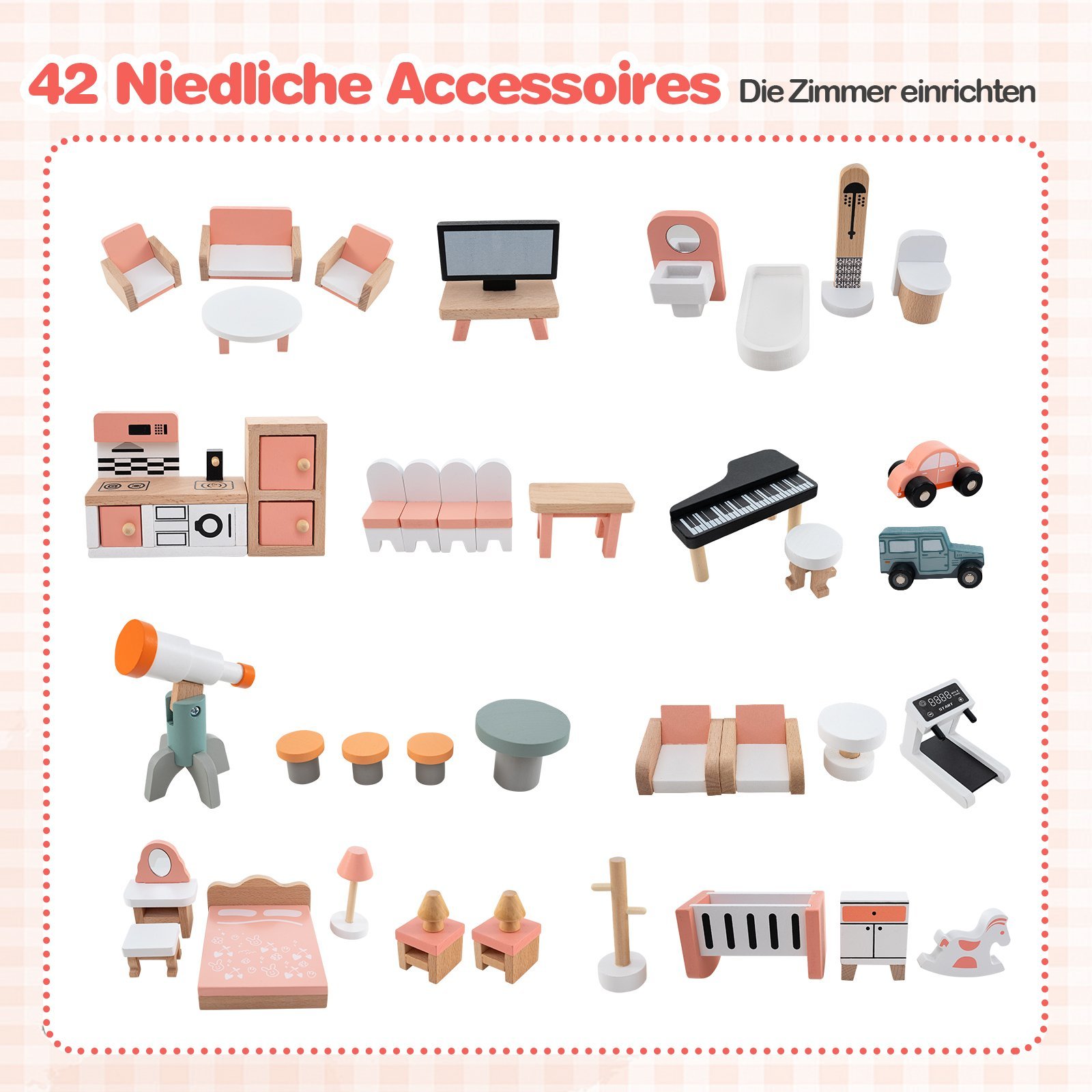 Medinis kampinis lėlių namelis su 41 baldais (Oranžinė)