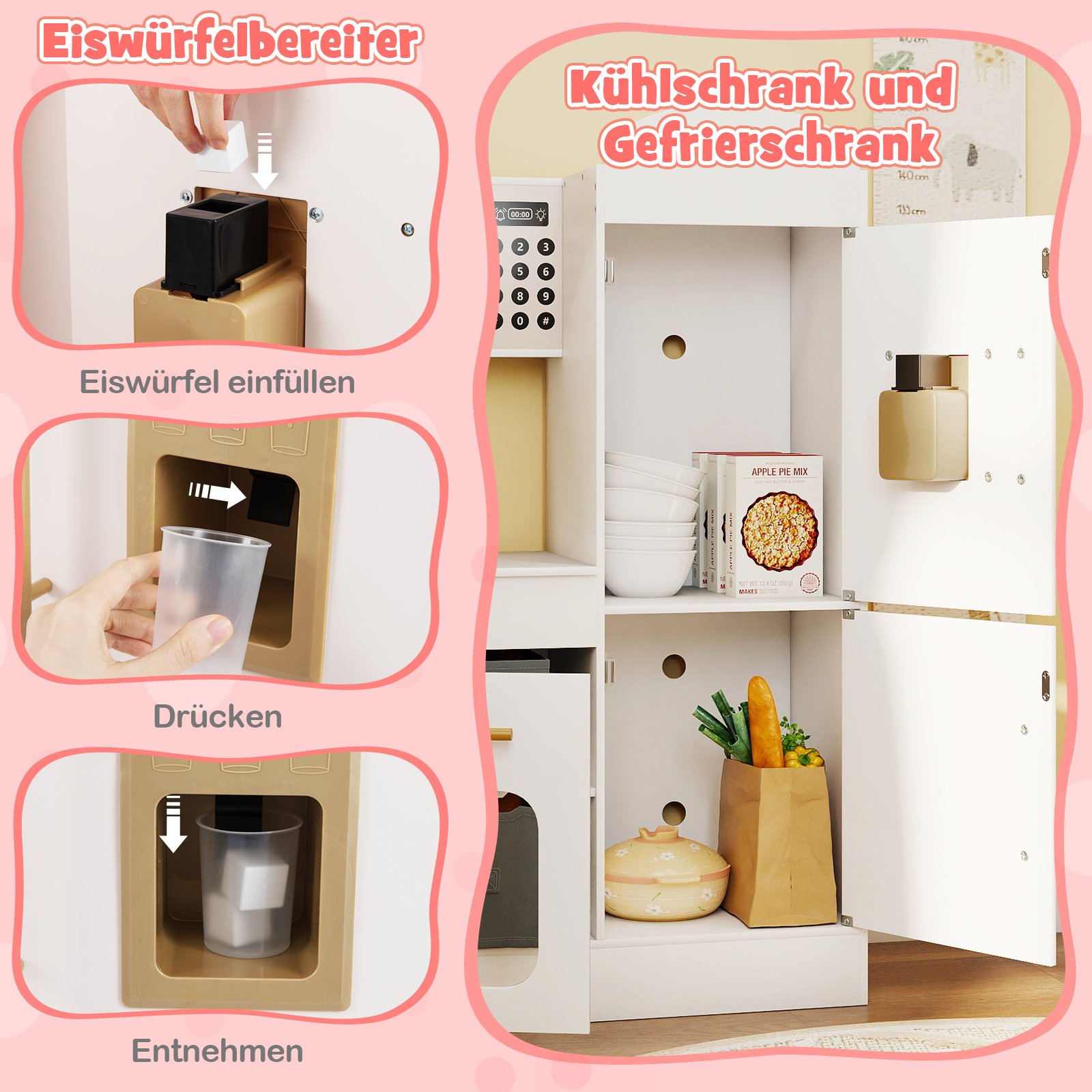 - Reališki virtuvės scenarijai: su šviečiančiomis kaitlentėmis, tikroviškais garsais ir ledo kubelių aparatu, leidžiančiu vaikams įdėti ir išimti ledo kubelius.