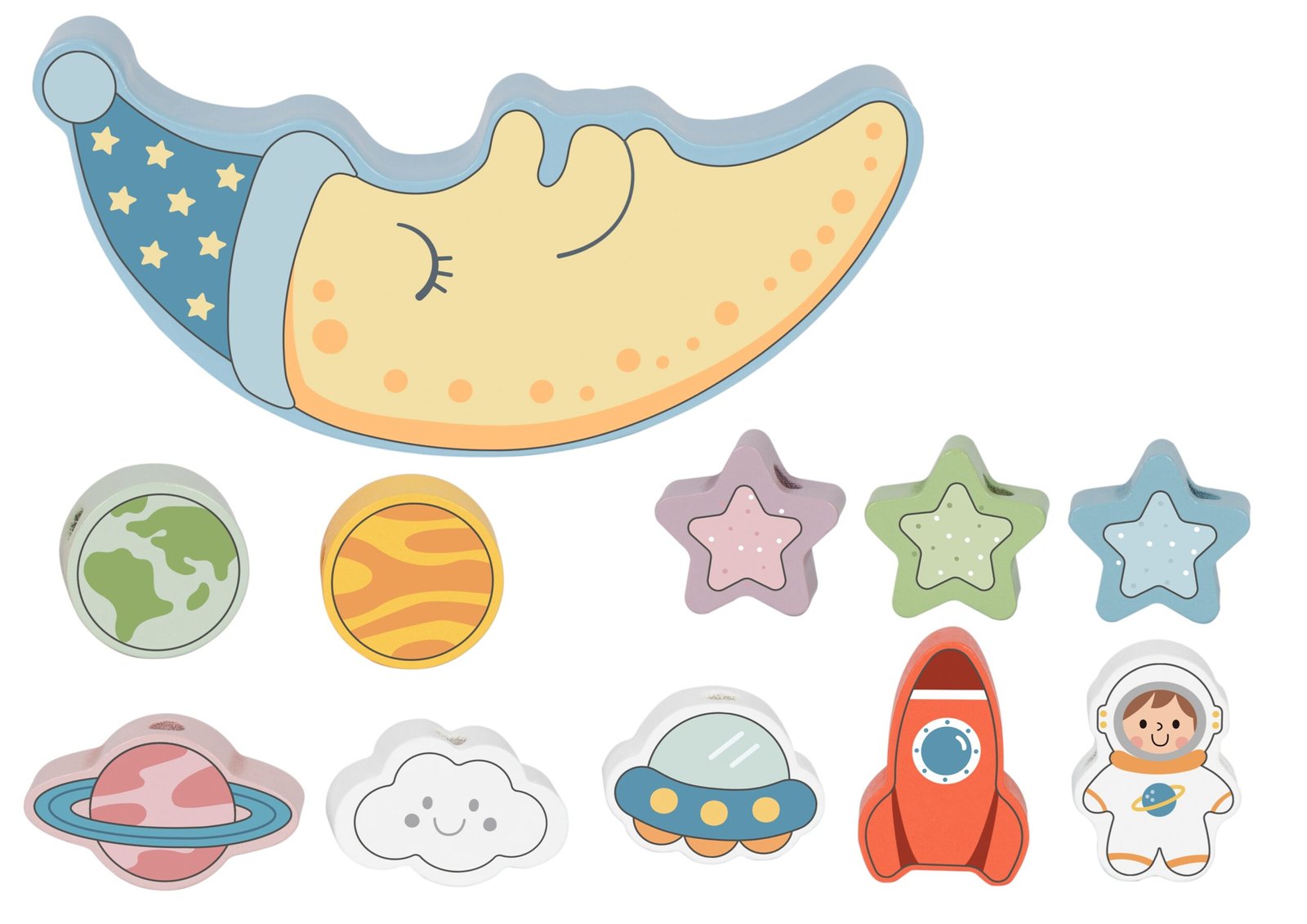 Pirmąją rinkinio dalį sudaro balansavimo užduotis. Vaikų tikslas – sudėlioti 10 spalvotų kosminių figūrėlių – raketą, astronautą, žvaigždes, NSO, planetas ir linksmą debesėlį – ant miegančio mėnulio veido taip, kad konstrukcija nenugriūtų. Šis žaidimas ugdo tikslumą ir kantrybę.