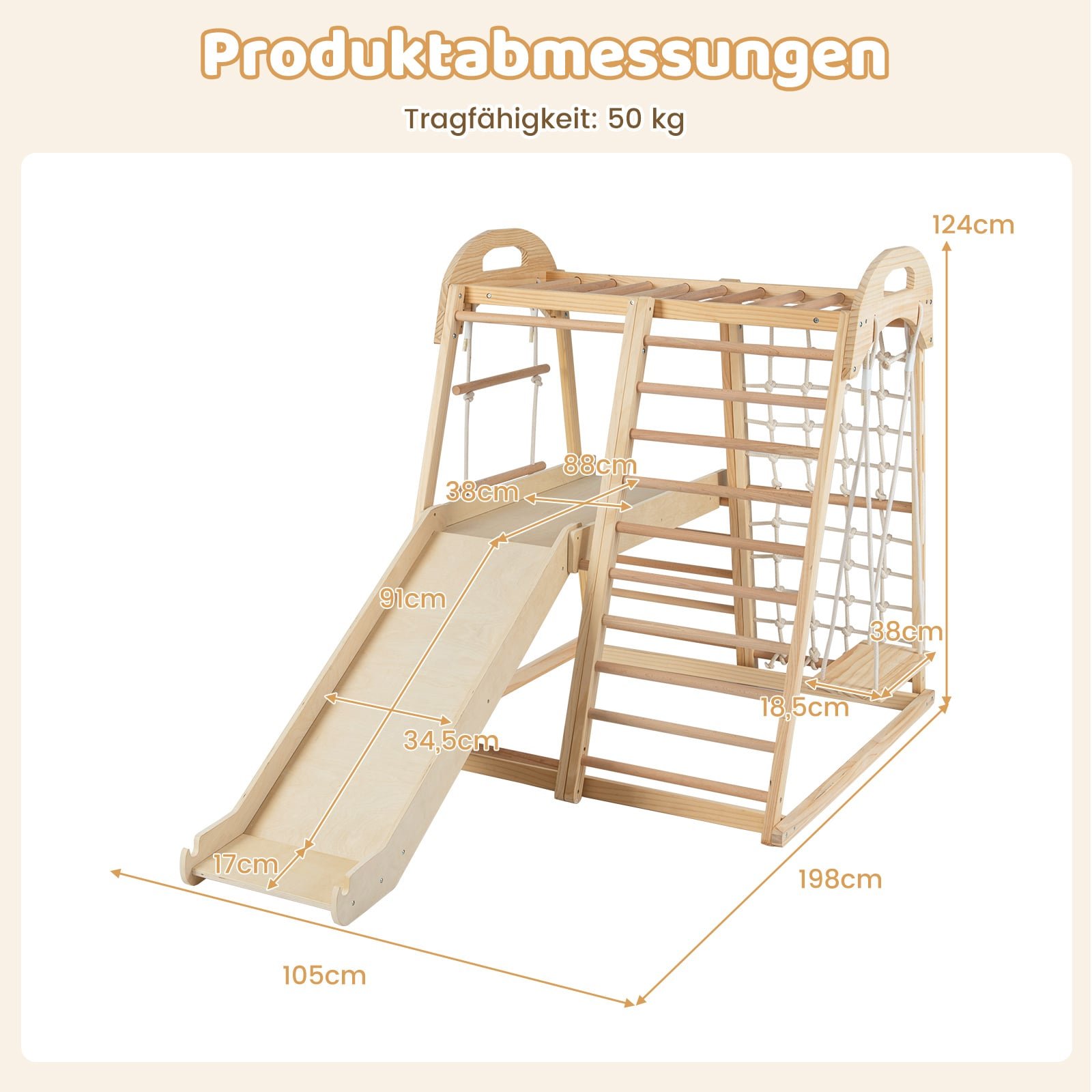 - Universalus 8-viename dizainas: Beždžionių kopėčios, čiuožykla, sūpynės, laipiojimo tinklas, kopėčios, laipiojimo uolos, virvinės kopėčios ir poilsio platforma.