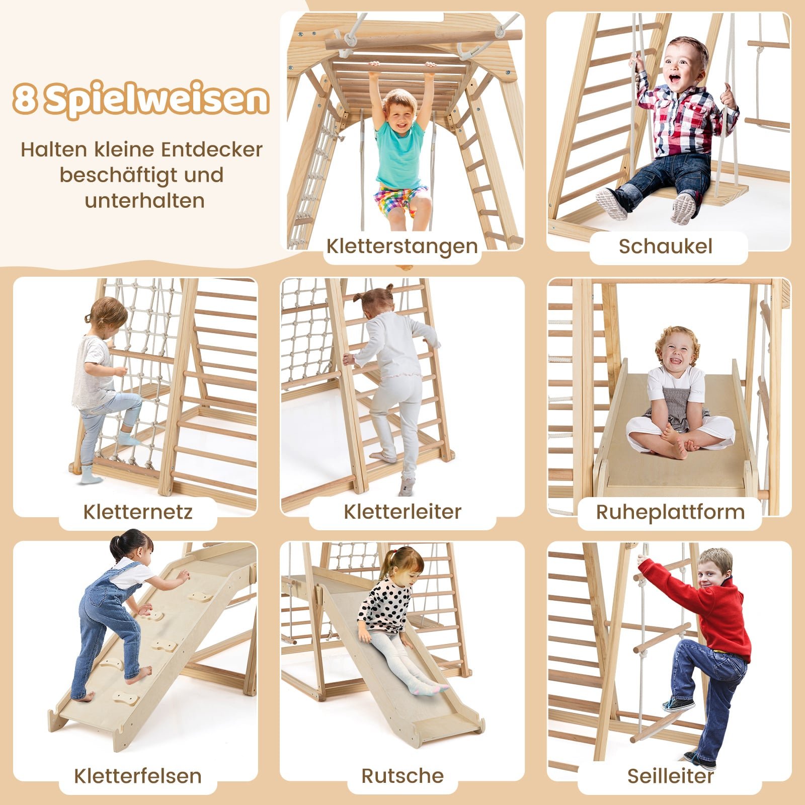 Medinis laipiojimo ir žaidimų rinkinys 8-in-1 (Natūrali)