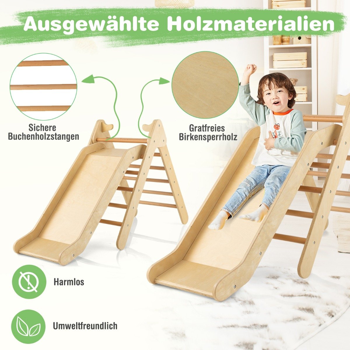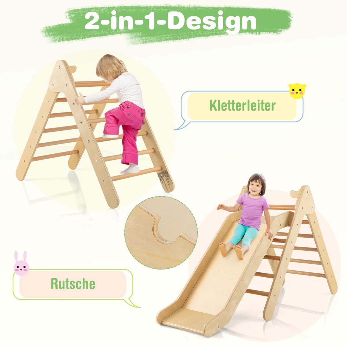 Šis medinis laipiojimo trikampis su čiuožykla greitai taps vienu mėgstamiausių vaikų žaislų. Jis suteikia vaikams laisvės tyrinėti ir žaisti, kartu ugdydamas pasitikėjimą savimi, pusiausvyros, koordinacijos, motorinius ir pažintinius įgūdžius. Tvirtos trikampės konstrukcijos dėka jis yra stabilus ir ilgaamžis.