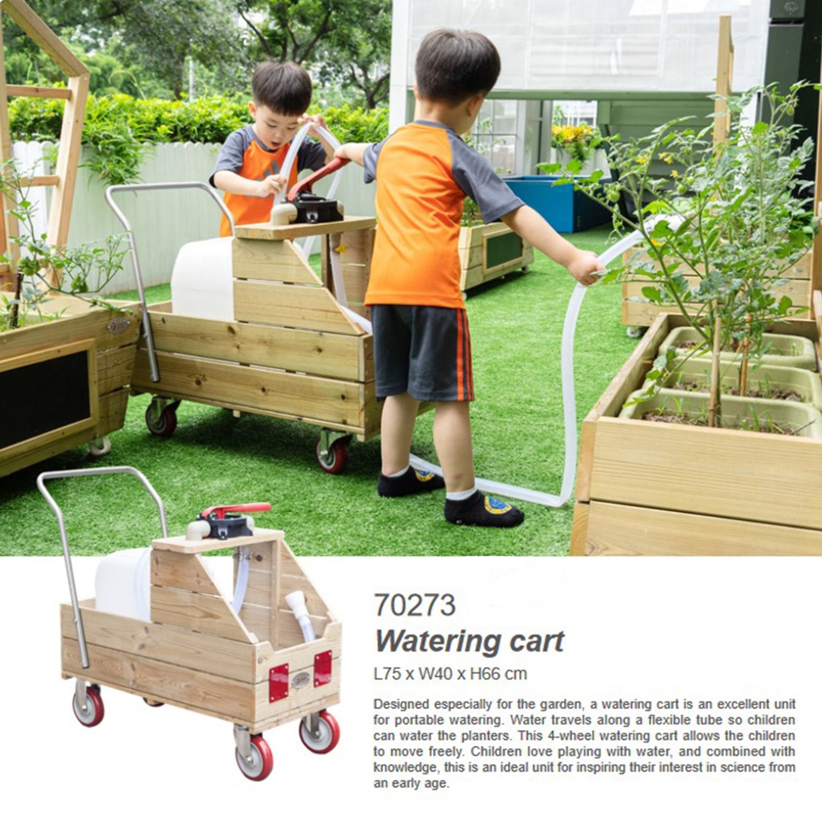 Medinis laistymo vežimėlis iš CLASSIC WORLD EDU serijos sukurtas vaikams, norintiems išmokti sodo darbų. Jis puikiai tinka augalams laistyti. Vanduo teka lanksčia žarna, todėl mažyliai gali lengvai laistyti augalus. Vaikai mėgsta žaisti su vandeniu, o šis vežimėlis sujungia smagų žaidimą su gamtos pažinimu ir ugdo atsakomybę, suteikdamas įdomią ir lavinančią patirtį.