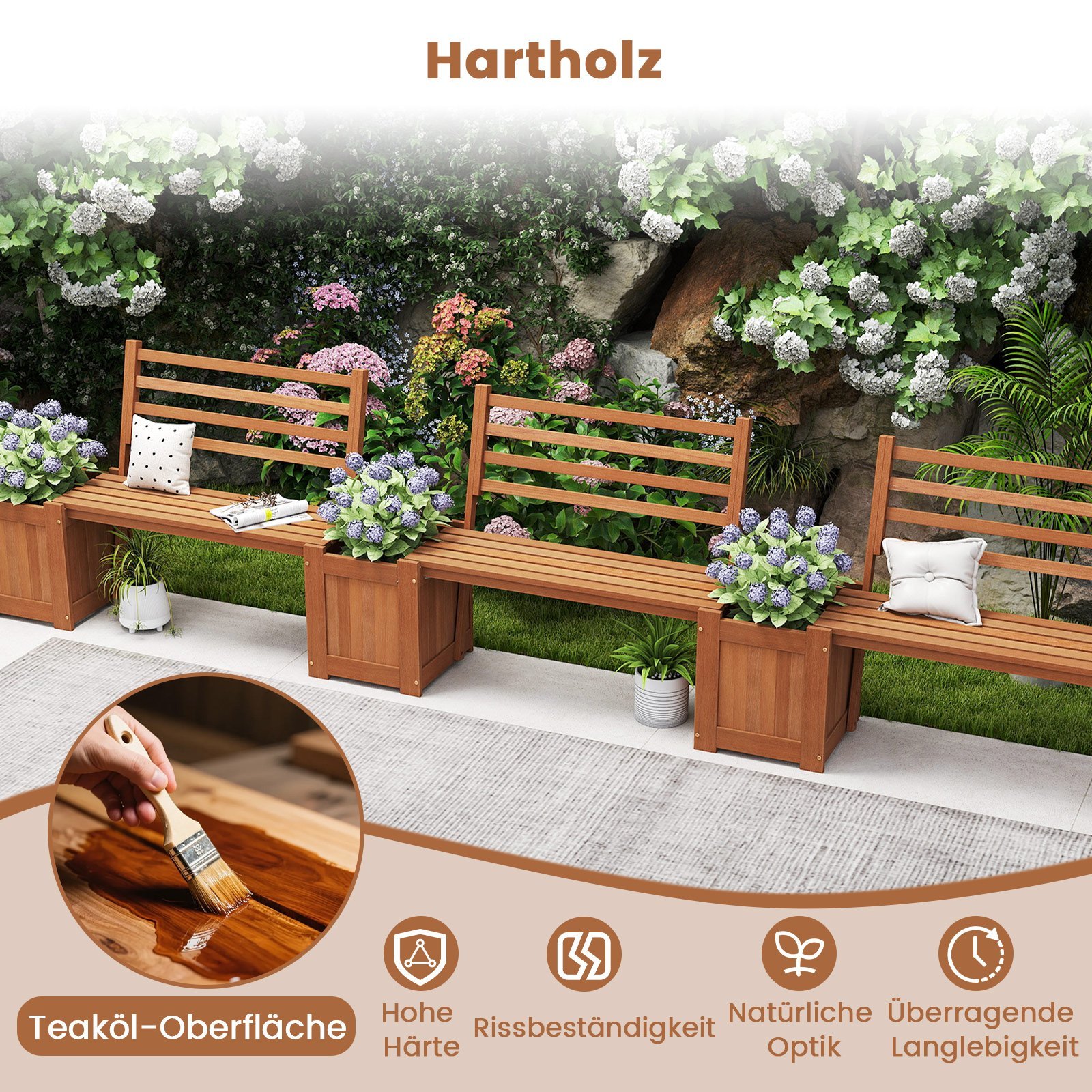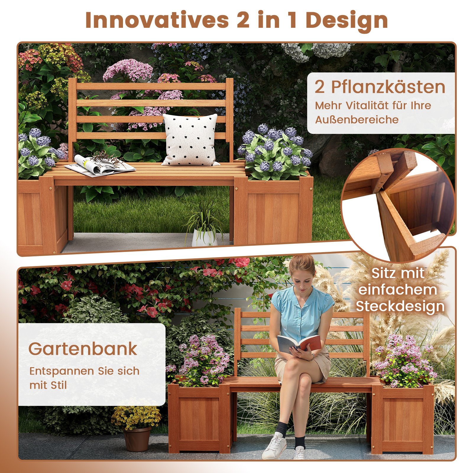 - Novatoriškas „du viename“ dizainas: patogus suolas su atlošu ir dvi gilios gėlių dėžės.