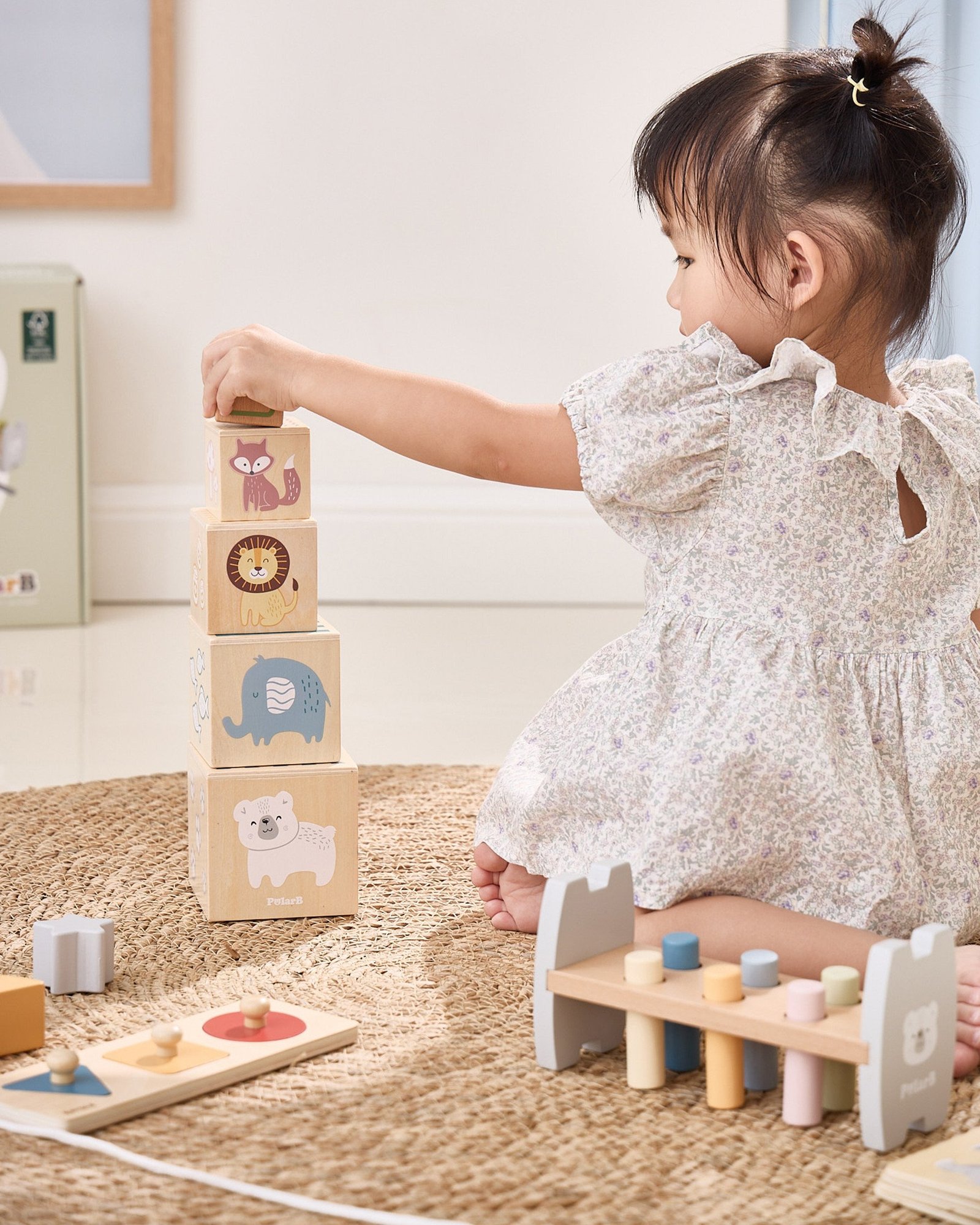 - Spalvingi raštai ir paprastos formos leidžia mokytis žaidžiant.