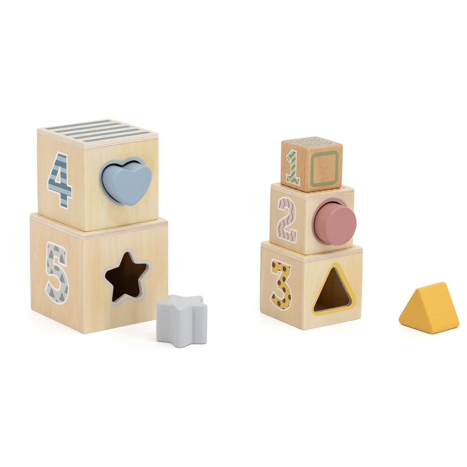 - Formų rūšiuoklis-piramidė – 5 kaladėlės dėliojimui, padedantis suprasti dydžio ir skaičiaus sąvokas.