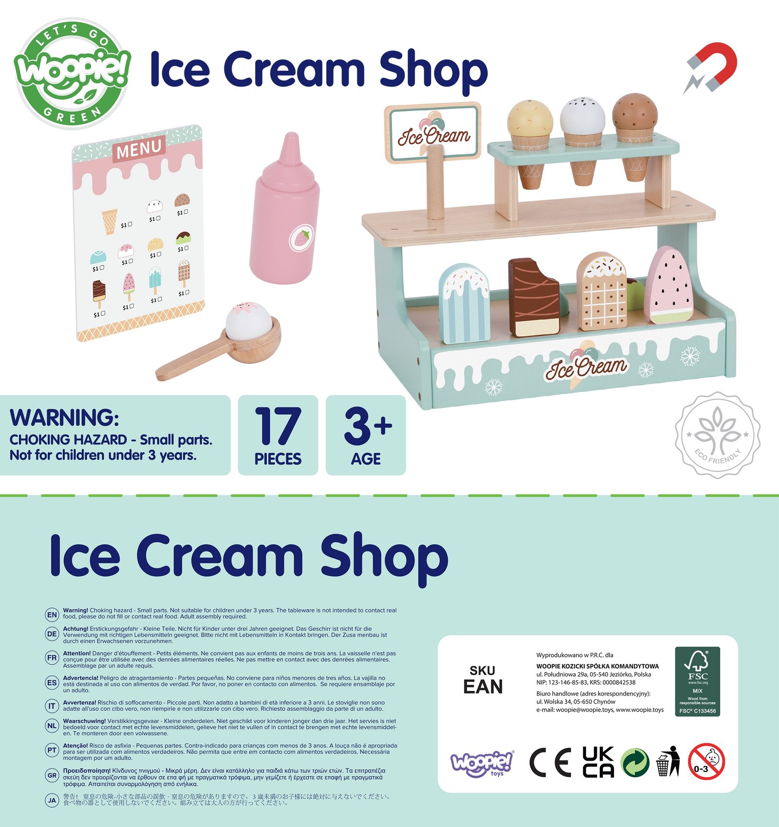 Šis pastelinių spalvų medinis ledų prekystalis – puikus žaislas mažiesiems kulinarijos ir konditerijos mėgėjams, leidžiantis jiems tapti tikrais ledų meistrais. Žaisdami parduotuvę, vaikai galės patiekti įvairius ledus – vafliniuose indeliuose, rutuliukus ar ledus ant pagaliuko. Visi elementai pagaminti iš patvarios, saugios medienos ir nudažyti netoksiškais, vaikams saugiais dažais. Magnetiniai ledų rutuliukai ir rinkinyje esantis meniu padės mažyliui įsijausti į tikro ledų pardavėjo vaidmenį, lavinant vaizduotę ir smulkiąją motoriką.