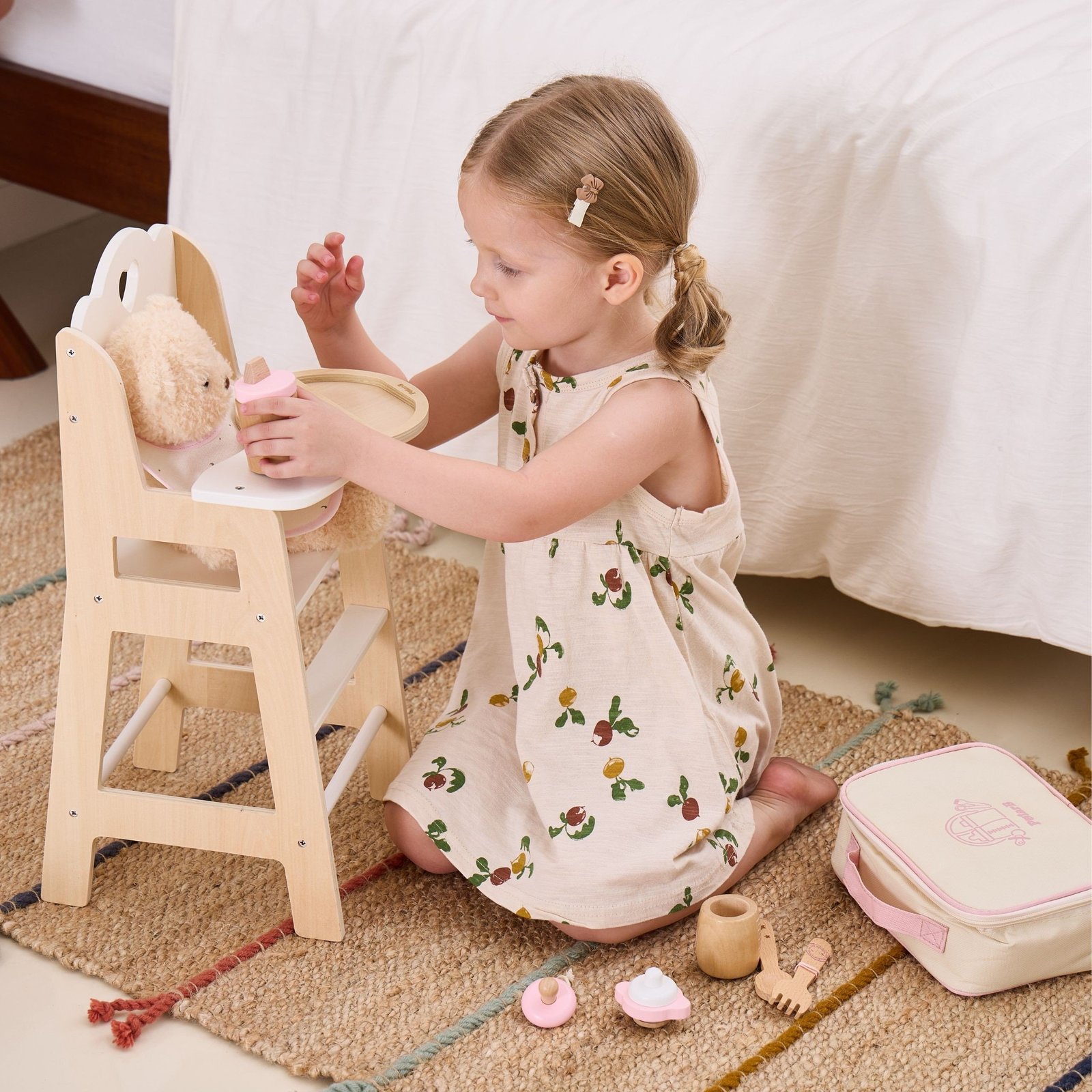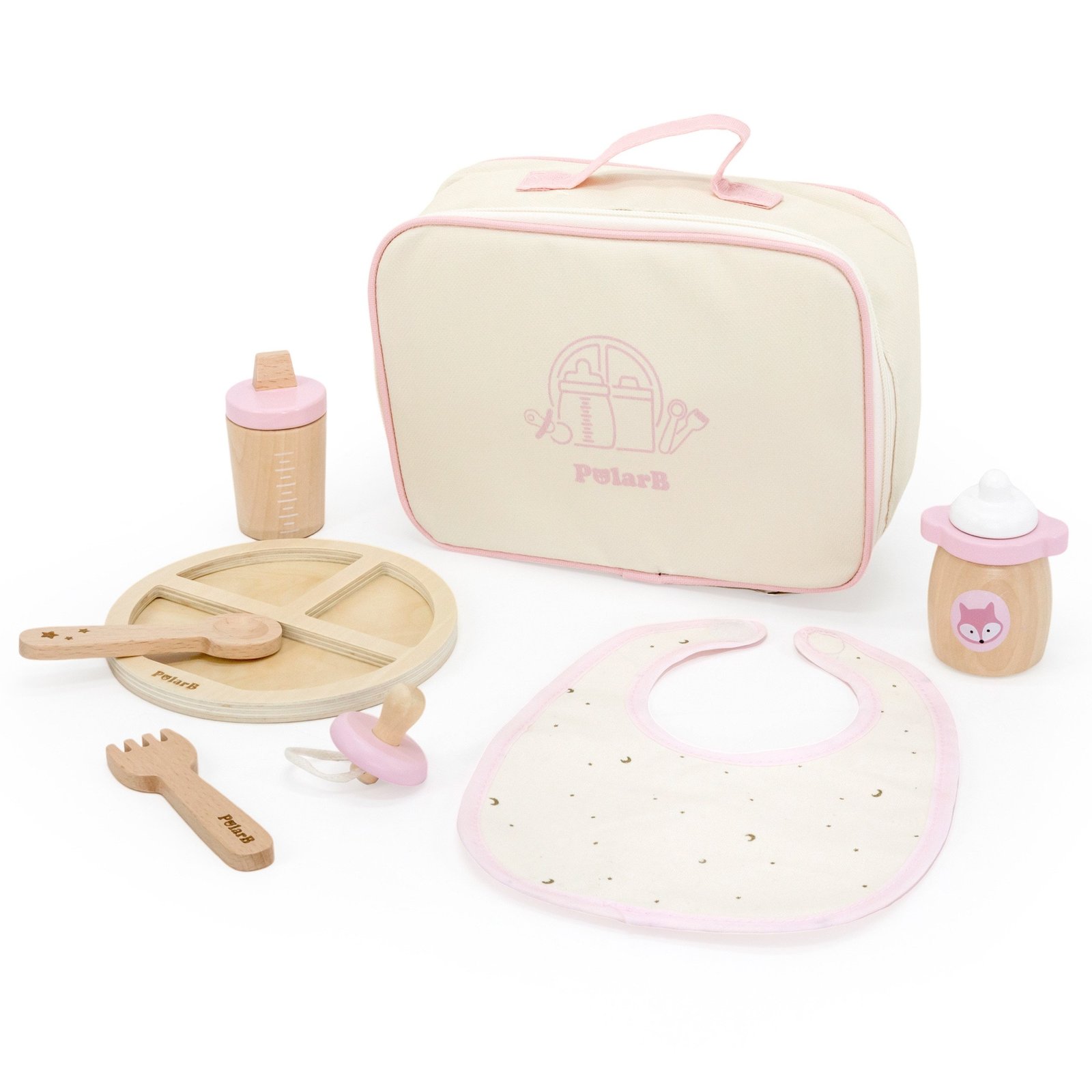 Medinis lėlių maitinimo rinkinys užsegamame krepšelyje