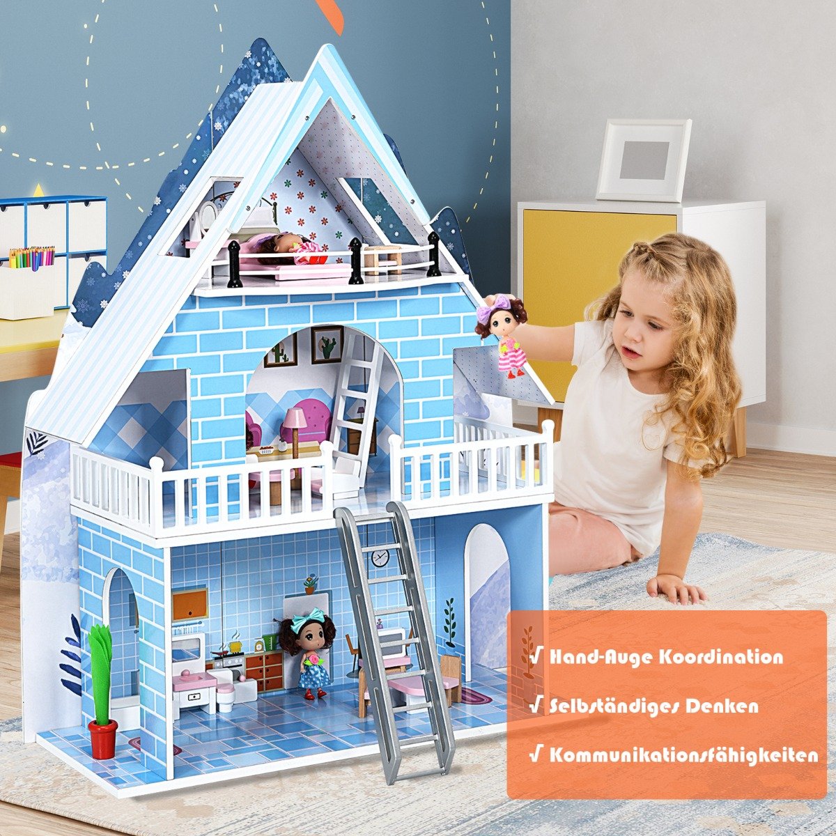 Medinis lėlių namelis su penkiolika baldų ir trimis lėlėmis (Mėlyna)