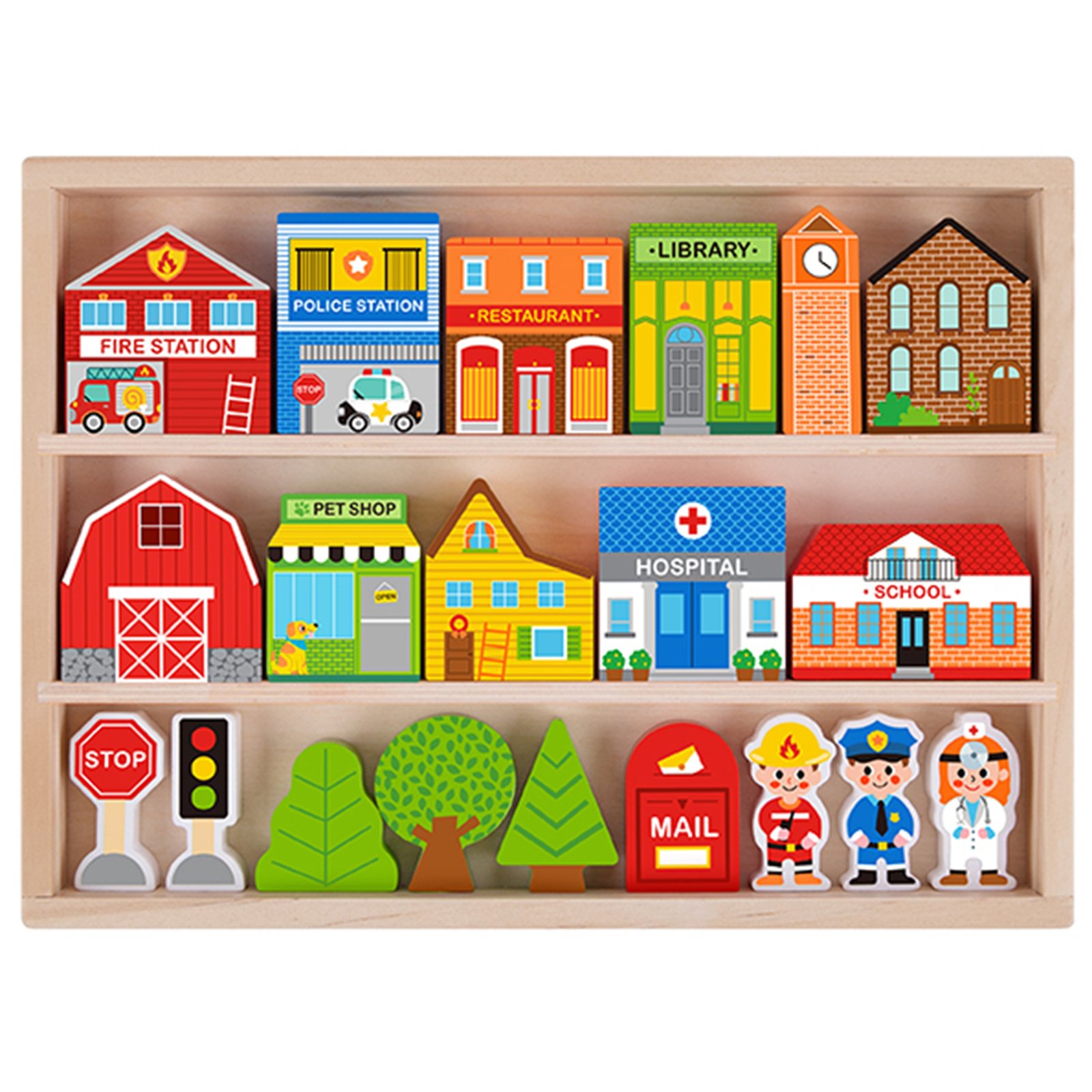 Leiskite vaikui sukurti savo miestą su šiuo medinių figūrėlių rinkiniu! Jį sudaro 21 kruopščiai pagaminta detalė, suteikianti neribotas galimybes kurti įvairias istorijas. Elegantiškoje medinėje dėžutėje telpa visas miniatiūrinis pasaulis: nuo gaisrinės, mokyklos ir ligoninės iki jaukių namelių ir kelio ženklų. Kiekvienas pastatas dažytas saugiais, netoksiškais dažais ir išsiskiria ryškiomis spalvomis, kurios žavi mažuosius kūrėjus.