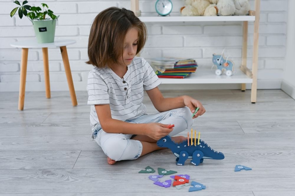 Medinis mokomasis dinozauras su skaičių kaladėlėmis