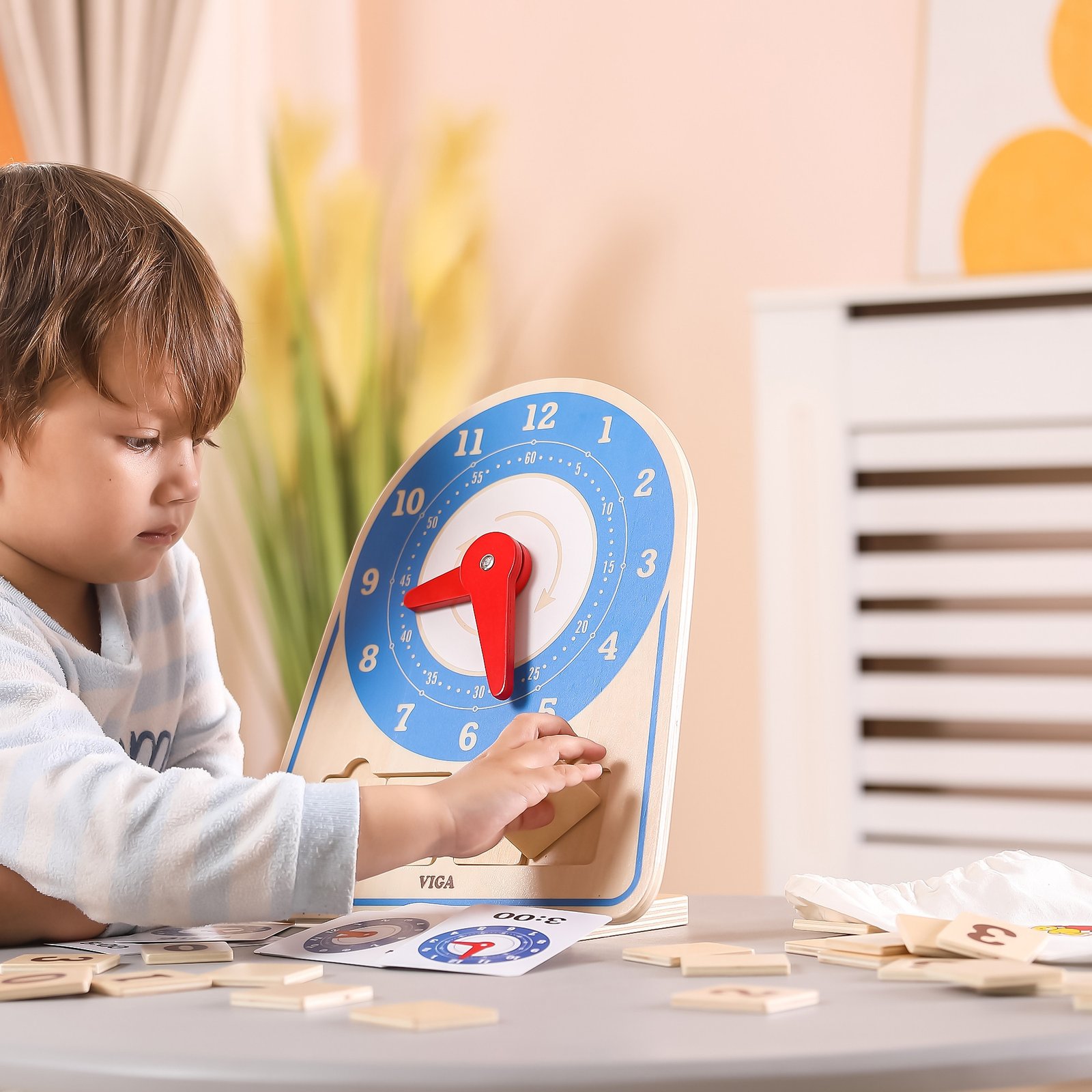 VIGA medinis mokomasis laikrodis – puikus žaislas, padedantis smagiai ir naudingai praleisti laiką su vaiku. Šis pastatomas žaislas padeda mažyliams mokytis atpažinti laiką. Jį sudaro dvi dalys: viršuje – analoginio laikrodžio ciferblatas su judančiomis rodyklėmis, apačioje – elektroninio laikrodžio laiko rodmuo. Rinkinį papildo 12 mokomųjų kortelių ir medinės lentelės su skaičiais, kurios padeda vaikui mokytis valandų ar savarankiškai nustatyti norimą laiką. Žaisdamas vaikas lavina rankų ir akių koordinaciją bei loginį mąstymą. Prie laikrodžio pridedamas ekologiškas krepšys, skirtas patogiai laikyti visus priedus. Žaislas pagamintas iš lakuotos medienos ir nudažytas netoksiškais, ryškiaspalviais dažais, kurie patrauks kiekvieno mažylio dėmesį. Tinka vaikams nuo 3 metų.