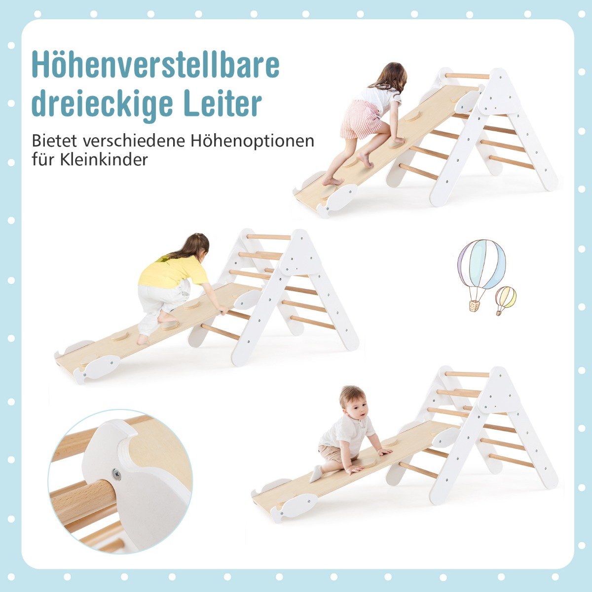 Padovanokite vaikams džiaugsmo ir aktyvių žaidimų su šiuo mediniu Montessori laipiojimo trikampiu, kurį sudaro čiuožykla ir laipiojimo lankas. Tai puikus derinys, skatinantis vaiko fizinę ir pažintinę raidą.