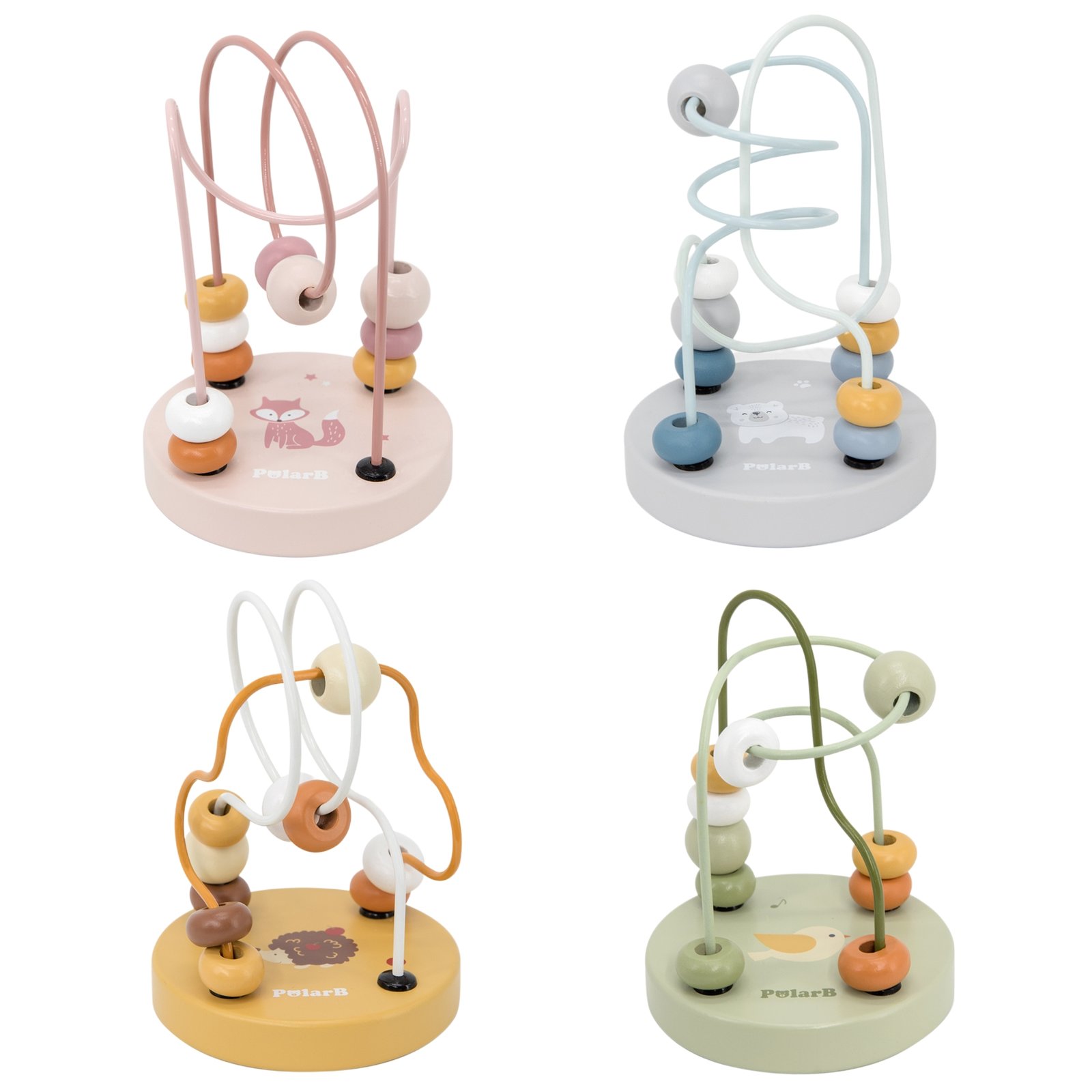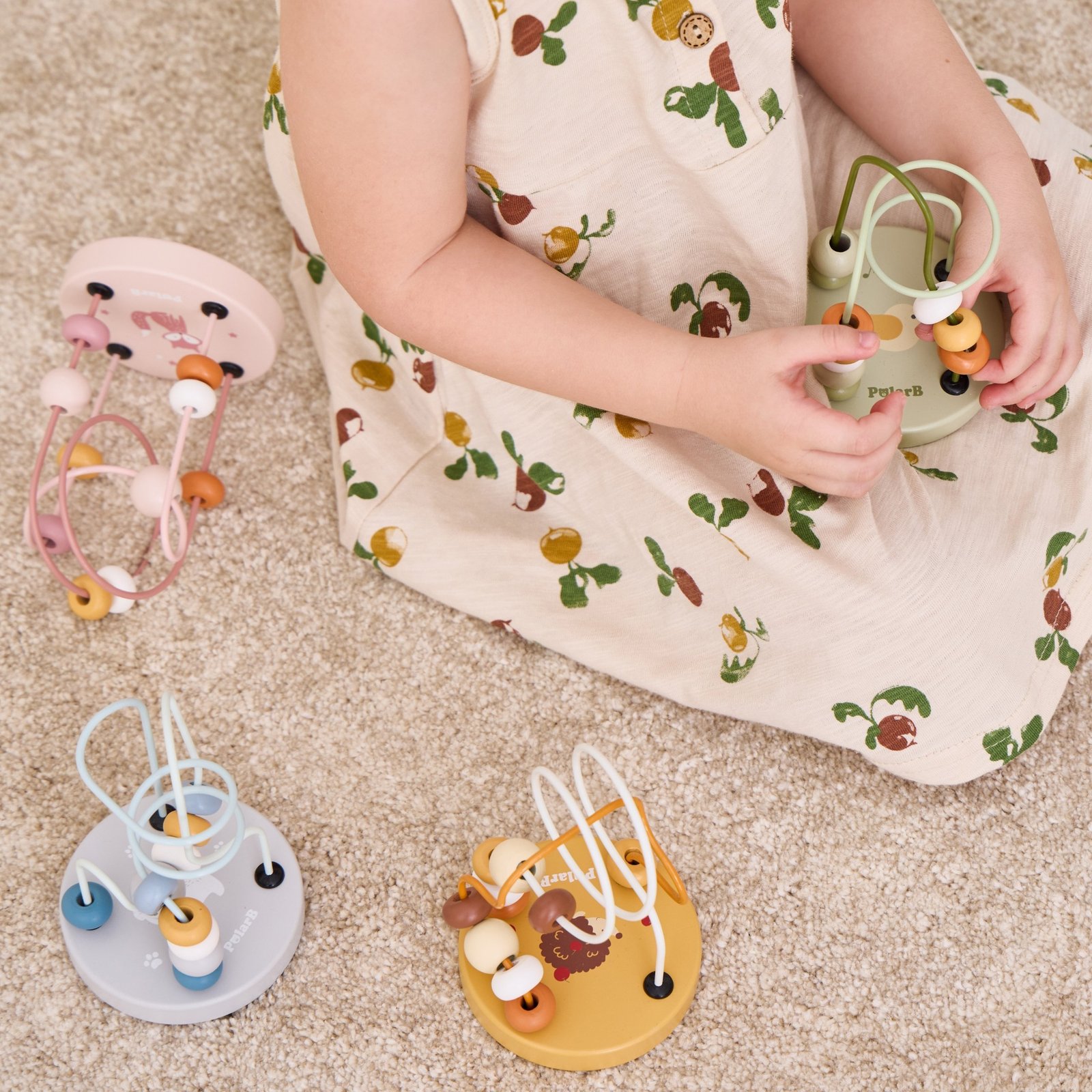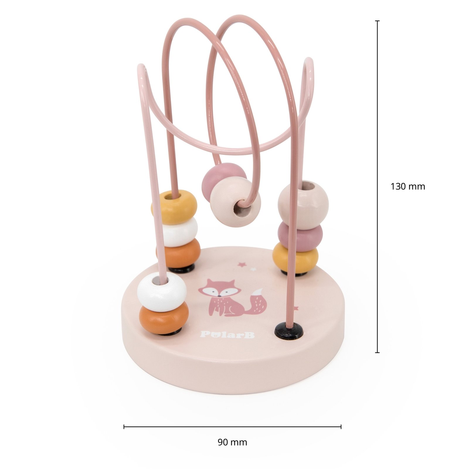 Ant tvirto medinio pagrindo puikuojasi spalvingas piešinys, prie kurio saugiai pritvirtinti strypeliai. Ant jų suverti 10 įvairių spalvų ir dviejų skirtingų formų karoliukų, kurie iškart patrauks mažylio dėmesį ir skatins tyrinėti.