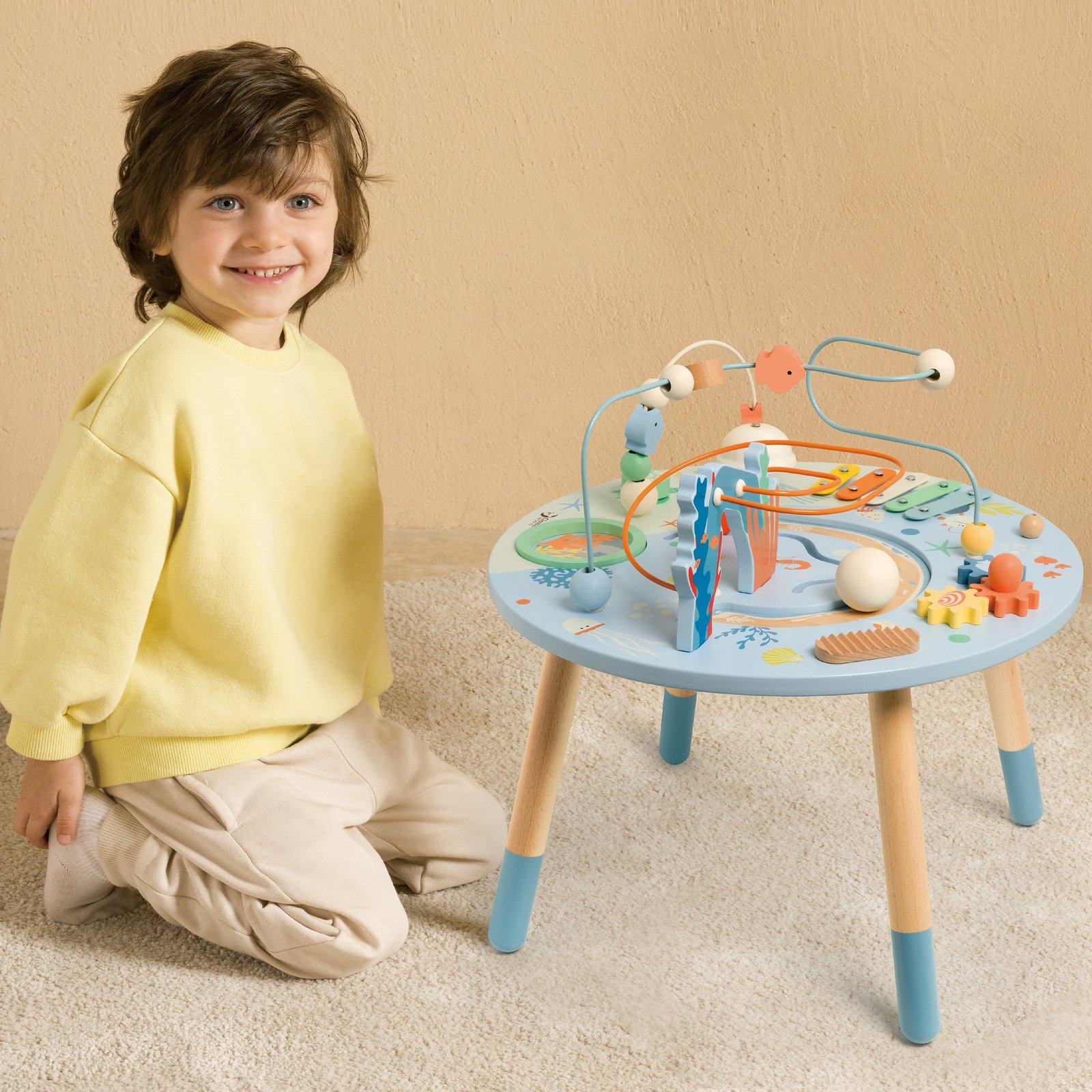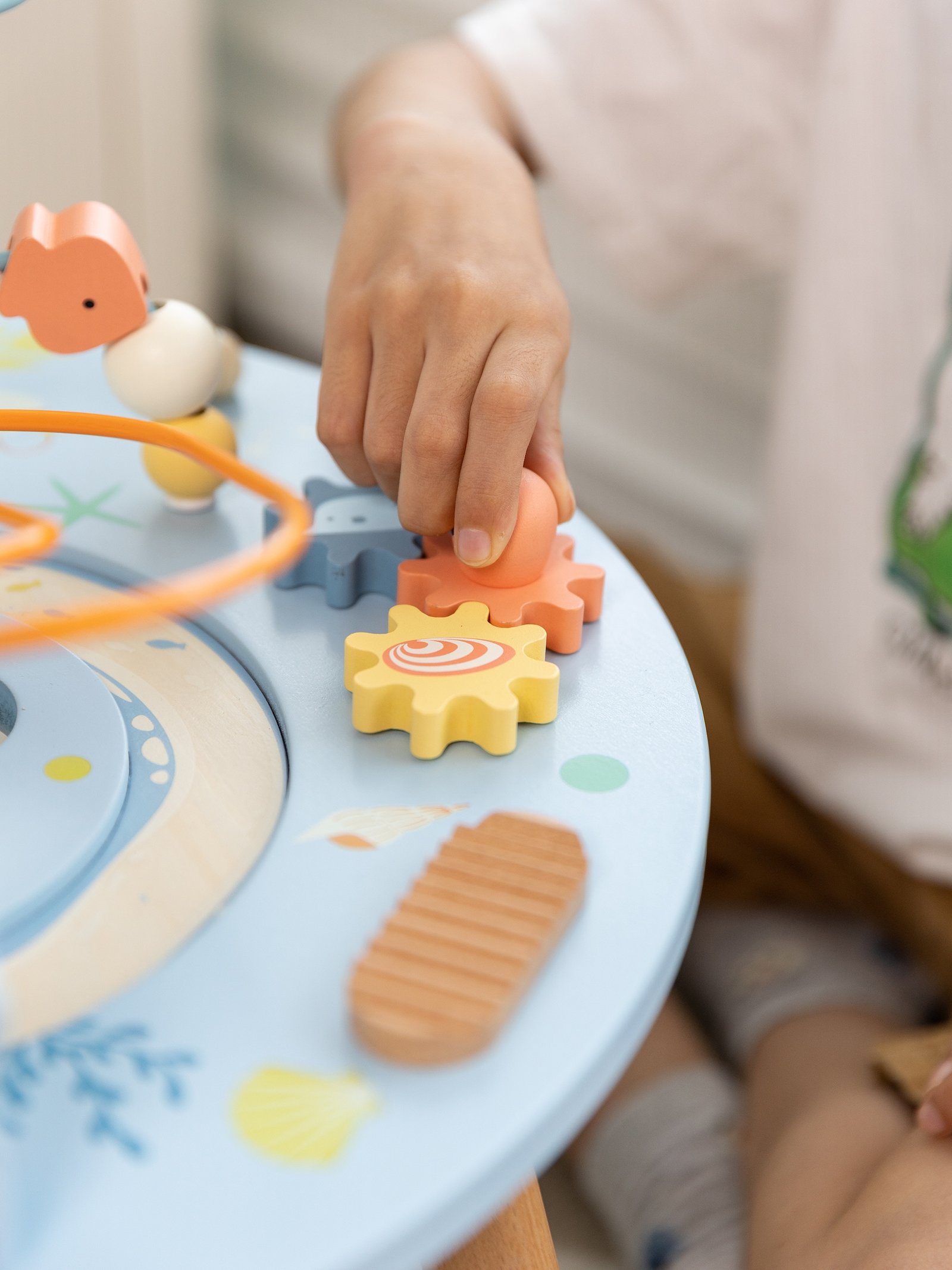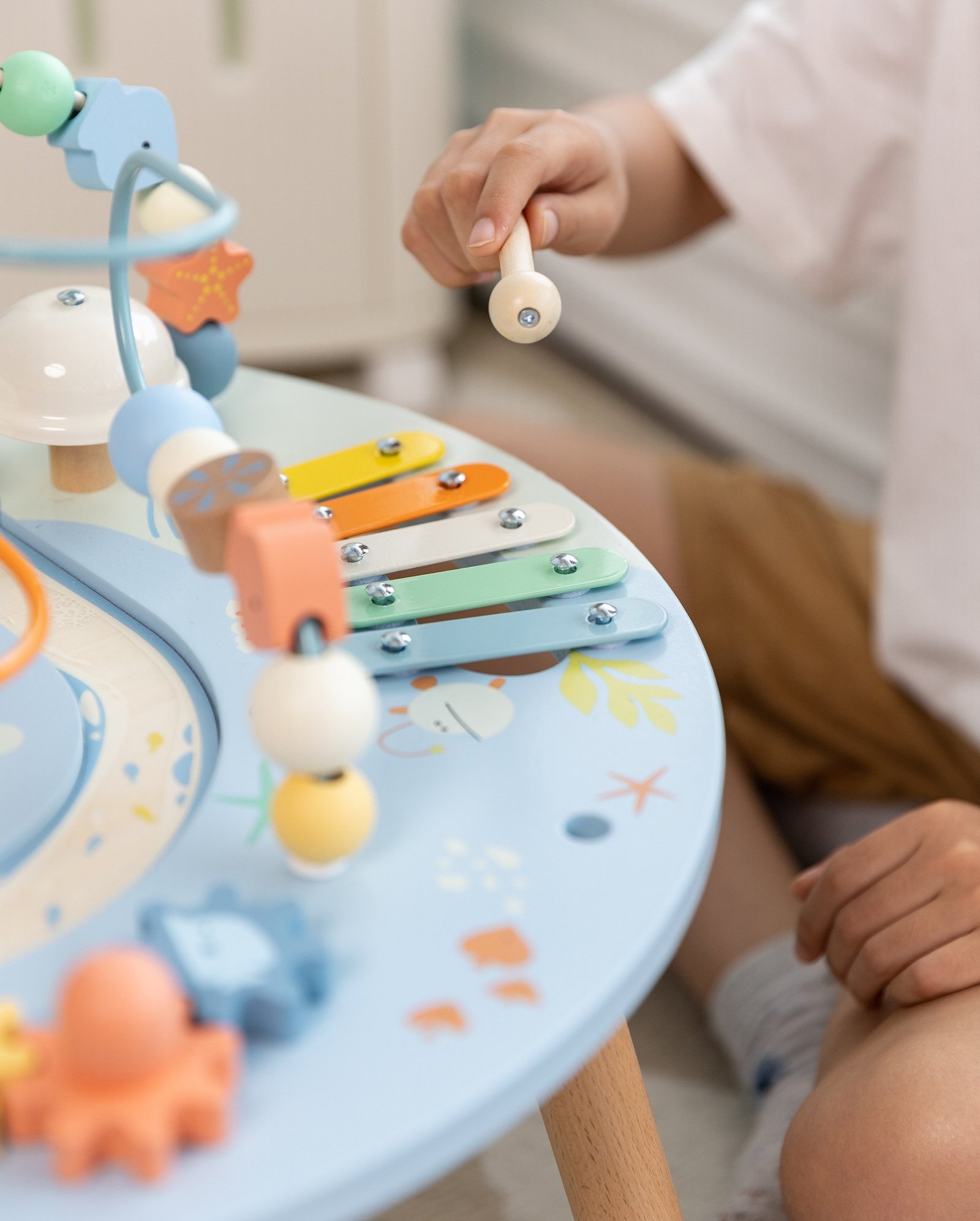 Medinis veiklos staliukas – puikus pasirinkimas smalsiems mažyliams. Jame gausu spalvingų veiklų, tokių kaip motorinė spiralė, krumpliaračiai, cimbolai ir būgnelis, kurios ne tik užtikrins daug džiaugsmo, bet ir padės ugdyti svarbius įgūdžius: rankų miklumą, loginį mąstymą bei koordinaciją. Staliukas skatina žaisti atsistojus ir puikiai supažindina su formų bei spalvų pasauliu. Pagamintas iš medienos ir nudažytas saugiais dažais, šis staliukas yra visiškai saugus patiems mažiausiems.