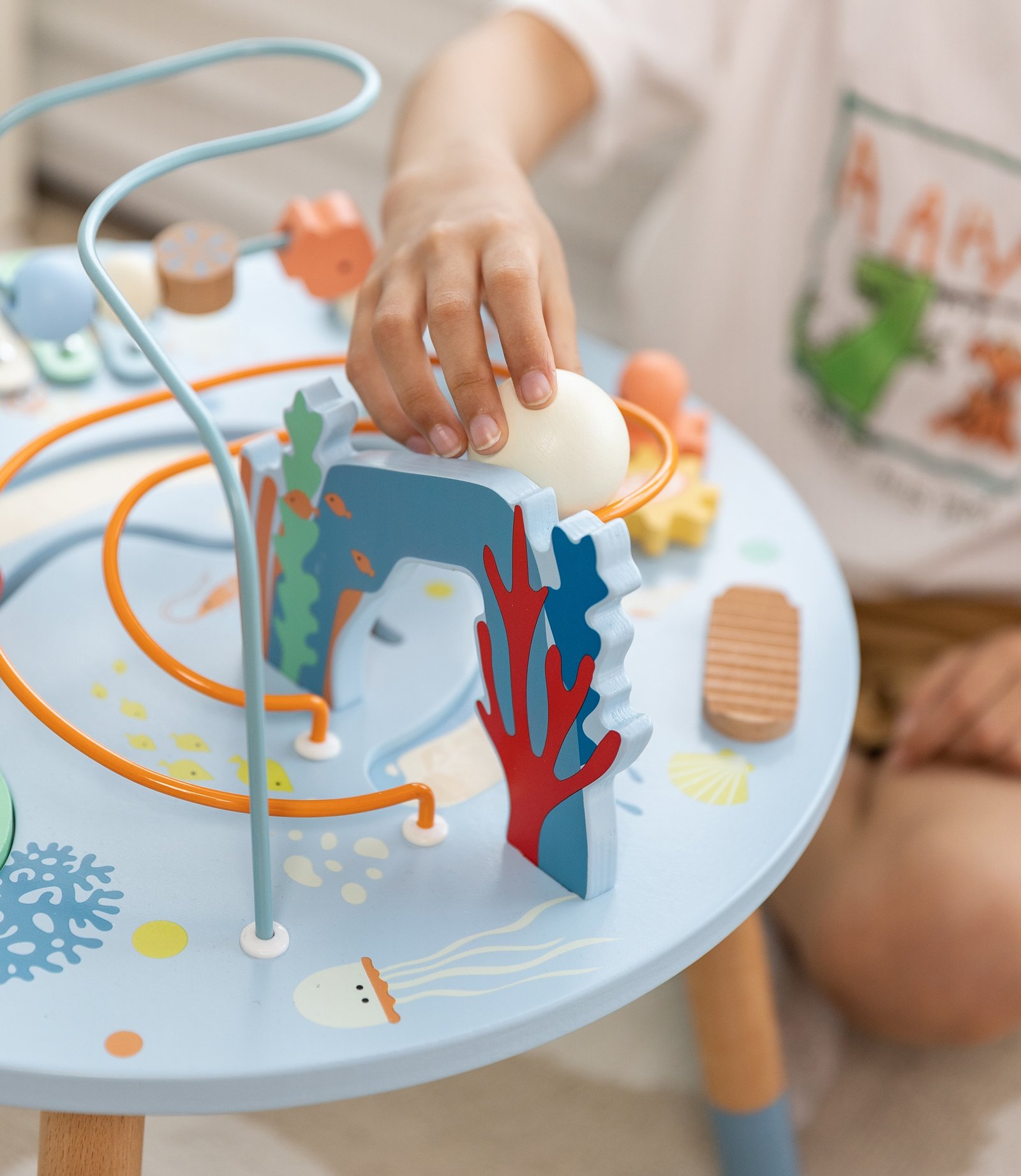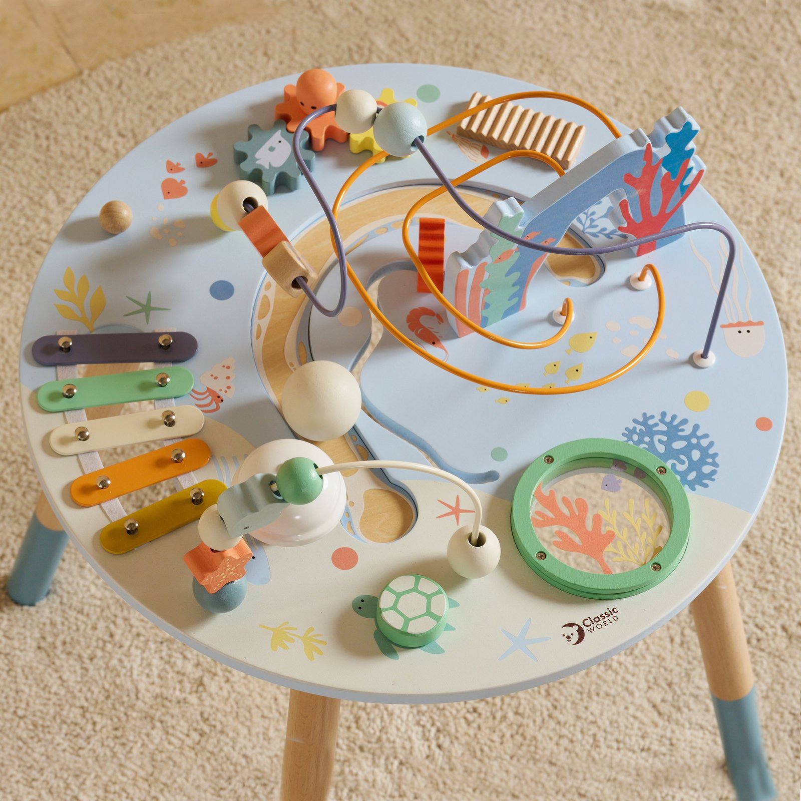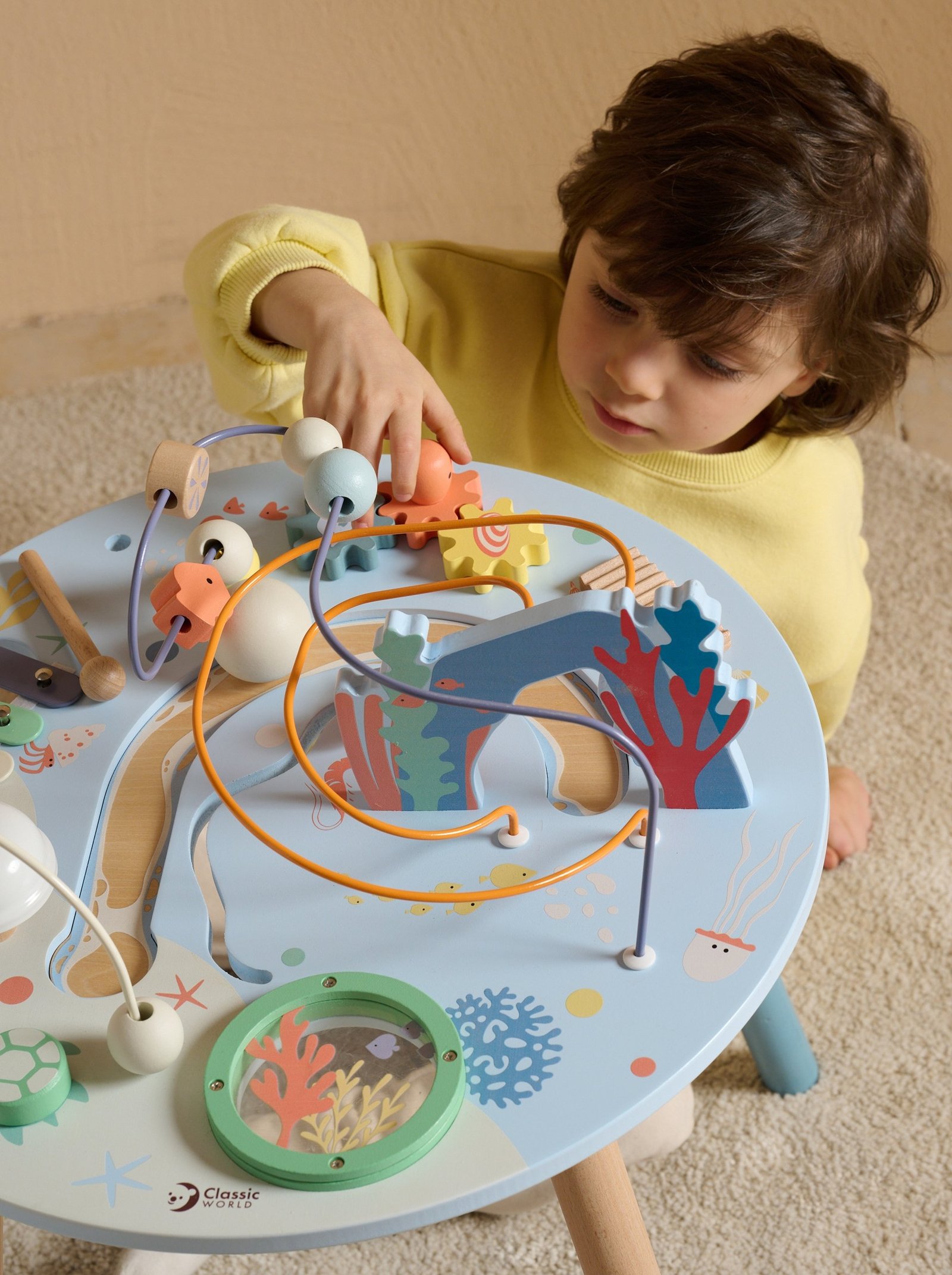Medinis veiklos staliukas – puikus pasirinkimas smalsiems mažyliams. Jame gausu spalvingų veiklų, tokių kaip motorinė spiralė, krumpliaračiai, cimbolai ir būgnelis, kurios ne tik užtikrins daug džiaugsmo, bet ir padės ugdyti svarbius įgūdžius: rankų miklumą, loginį mąstymą bei koordinaciją. Staliukas skatina žaisti atsistojus ir puikiai supažindina su formų bei spalvų pasauliu. Pagamintas iš medienos ir nudažytas saugiais dažais, šis staliukas yra visiškai saugus patiems mažiausiems.