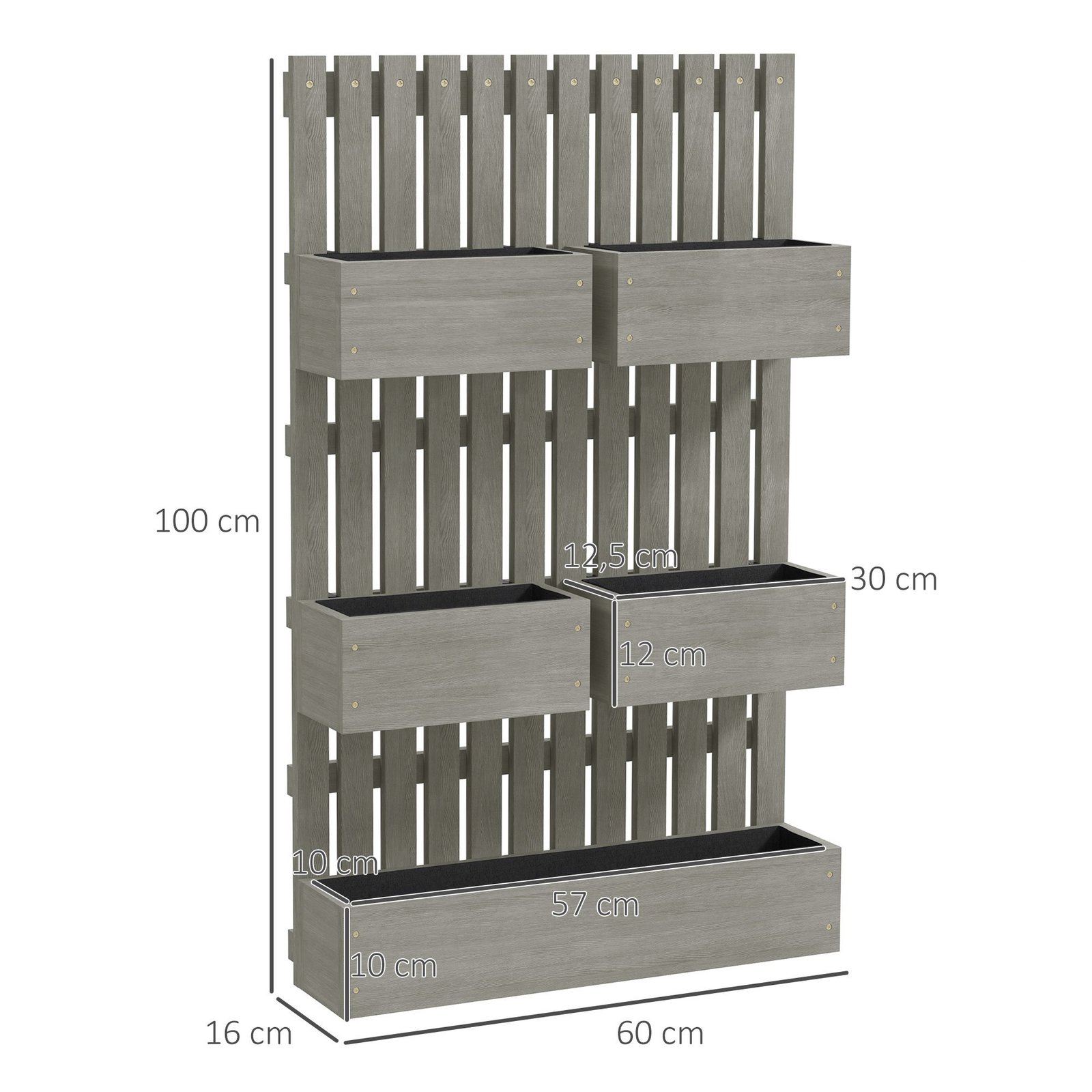 Mūsų kaimiškas aukštas gėlynas iš masyvios eglės medienos su atrama vijokliniams augalams skatina lankstų sodininkystę. Penki pakelti sodinimo vazonai užpakalinėje sienelėje suteikia atramą vijokliniams augalams. Vazonų išdėstymas yra pritaikomas. Kiekvienas žolelių gėlynas turi dvi drenažo angas ir audinio filtrą, kuris apsaugo augalus. Padengtas apsauginiu laku, jis leidžia tvariai sodininkauti daugelį sezonų.