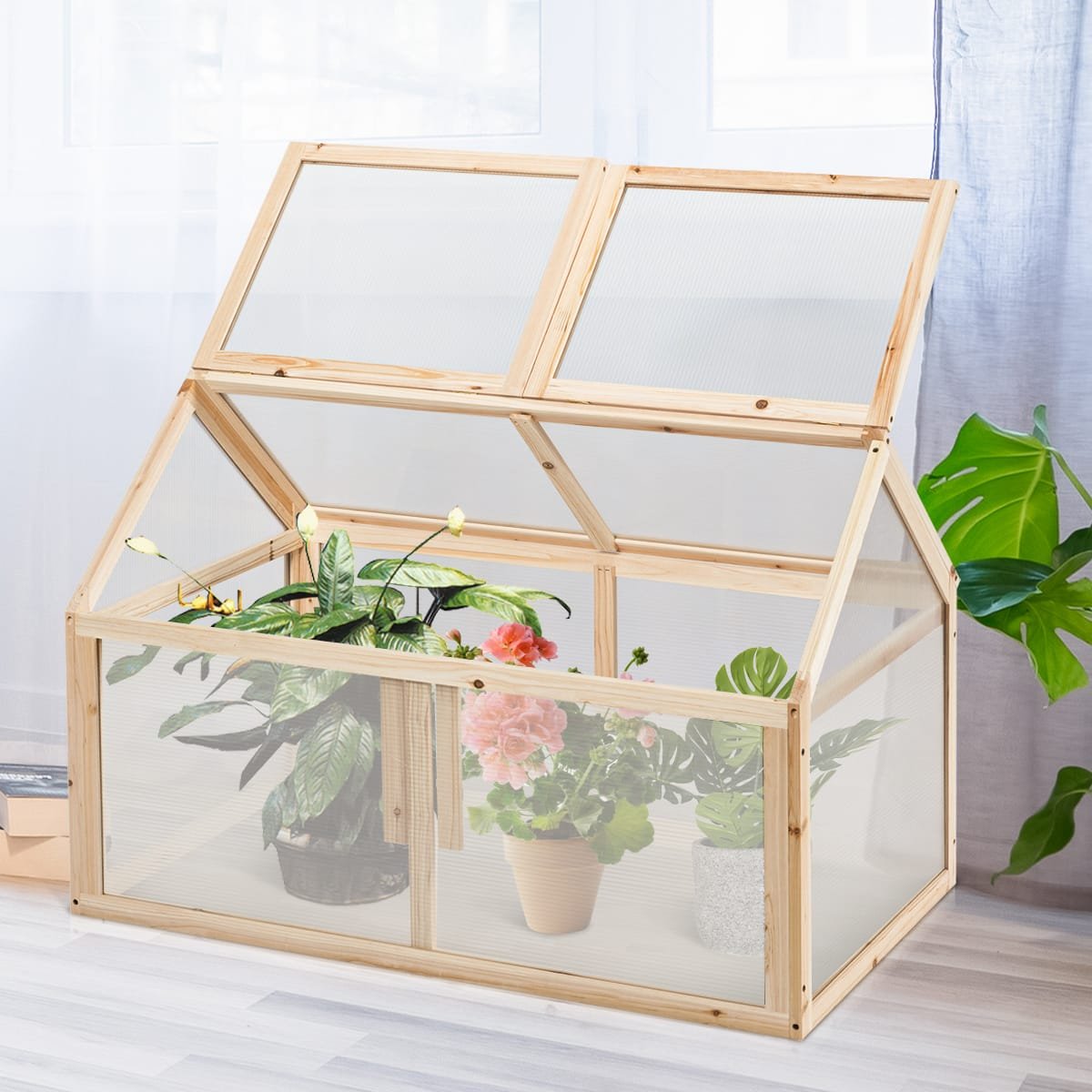 Atneškite gyvybės ir gaivumo į savo namus su šiuo mediniu šiltnamiu! Jo didelis stabilumas ir ilgaamžiškumas užtikrinamas dėl aukštos kokybės eglės medienos su apsaugine danga ir polikarbonato lakštų. Šios medžiagos padeda efektyviai sulaikyti šilumą viduje.
