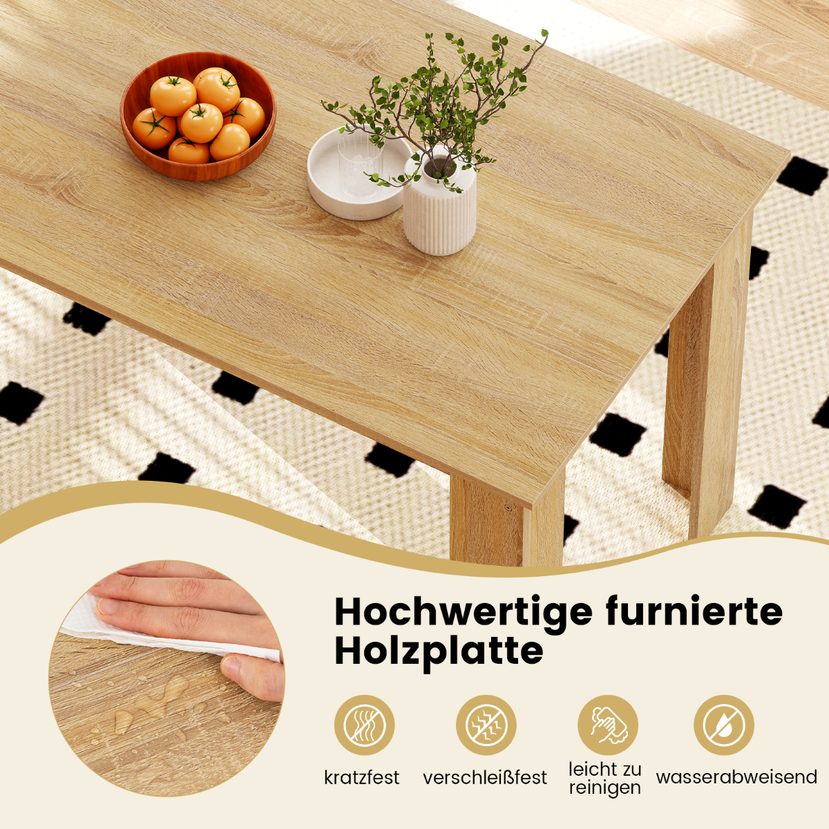 - Lengva priežiūra: Lygiu laminuotu stalviršiu, atsparus vandeniui ir įbrėžimams, lengvai valomas.