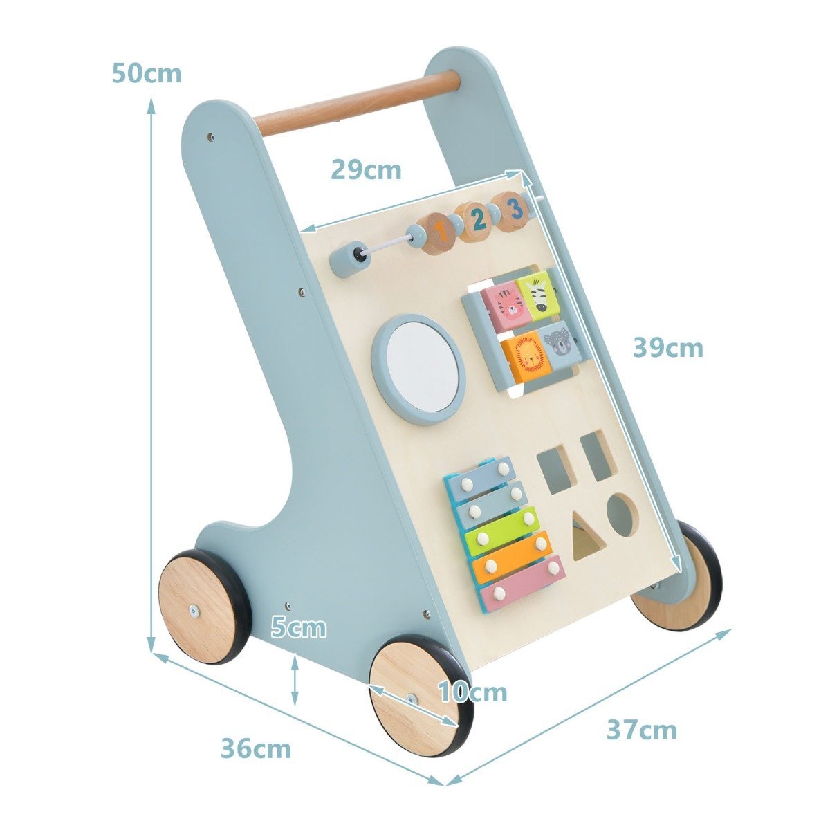Džiuginkite savo mažylį šiuo mediniu stumdomu vežimėliu, sukurtu vaikams nuo 10 mėnesių amžiaus. Jis ne tik padeda žengti pirmuosius žingsnius, bet ir suteikia daugybę pramogų bei lavina motorinius įgūdžius.