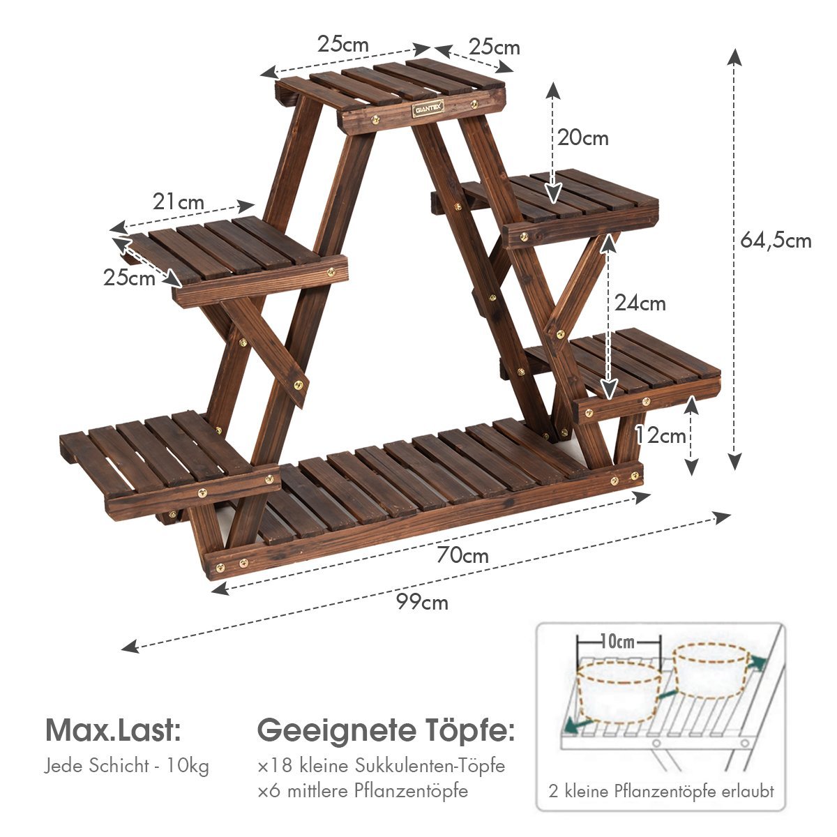 Praturtinkite savo namus šiuo nuostabiu gėlių stoveliu! Pagamintas iš tvirto pušies medienos, jis yra stabilus ir ilgaamžis. Aukštos temperatūros anglies apdorojimas užtikrina tvirtumą ir atsparumą apkrovoms. Be to, trikampė konstrukcija suteikia papildomo stabilumo.