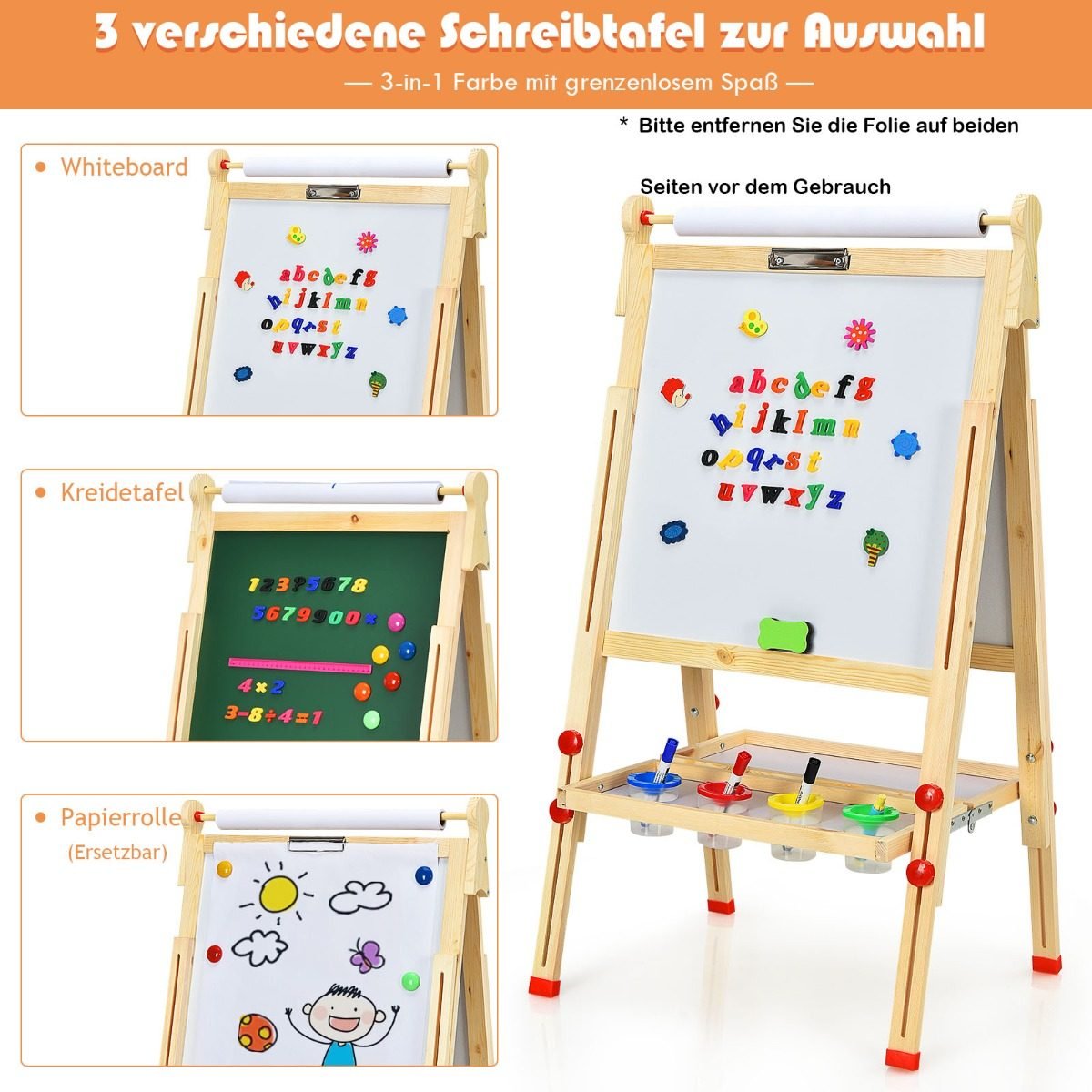 Ieškote puikios dovanos savo vaikams? Šis 3in1 dailininko stovas – ideali dovana, atverianti daugybę kūrybinių galimybių. Dėl integruoto popieriaus ritinėlio, magnetinės ir kreidinės lentų, vienu metu gali kurti net du vaikai. Reguliuojamas aukštis leidžia stovui „augti“ kartu su vaiku, o patogi lentynėlė padeda palaikyti tvarką piešimo priemonėms.