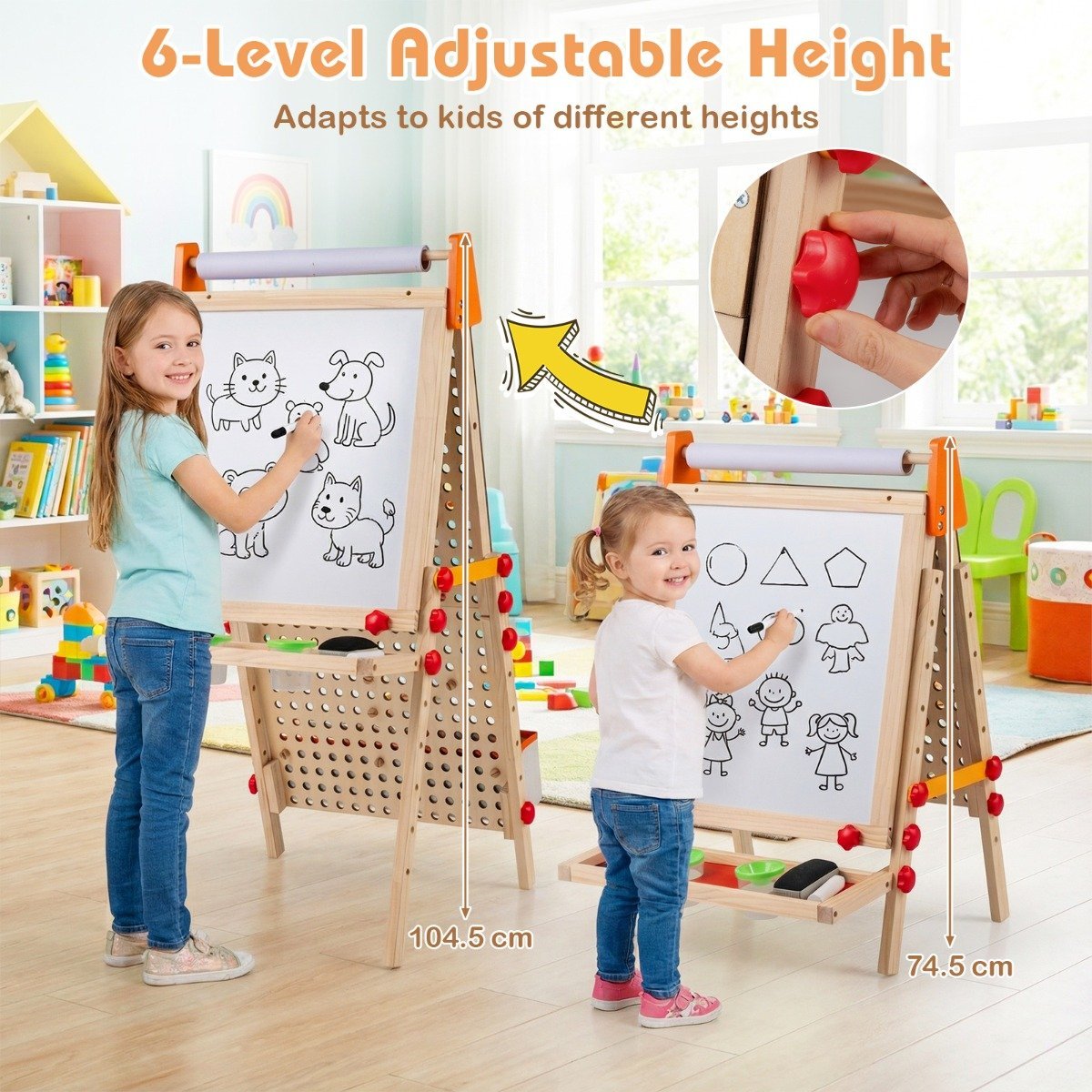 Atraskite neribotas kūrybines galimybes su šiuo mediniu vaikų molbertu „keturi viename“! Šis dvipusis molbertas apjungia savyje rutuliukų trasą, magnetinę baltąją lentą, kreidinę lentą ir popieriaus ritinį, skatindamas vaikų nuo 3 metų amžiaus fantaziją ir pažintinį vystymąsi. Su 6 reguliuojamo aukščio padėtimis jis auga kartu su Jūsų vaiku, užtikrindamas patogų ir ergonomišką naudojimą. Kai molbertas nenaudojamas, jį lengva sulankstyti, taip taupant vietą.