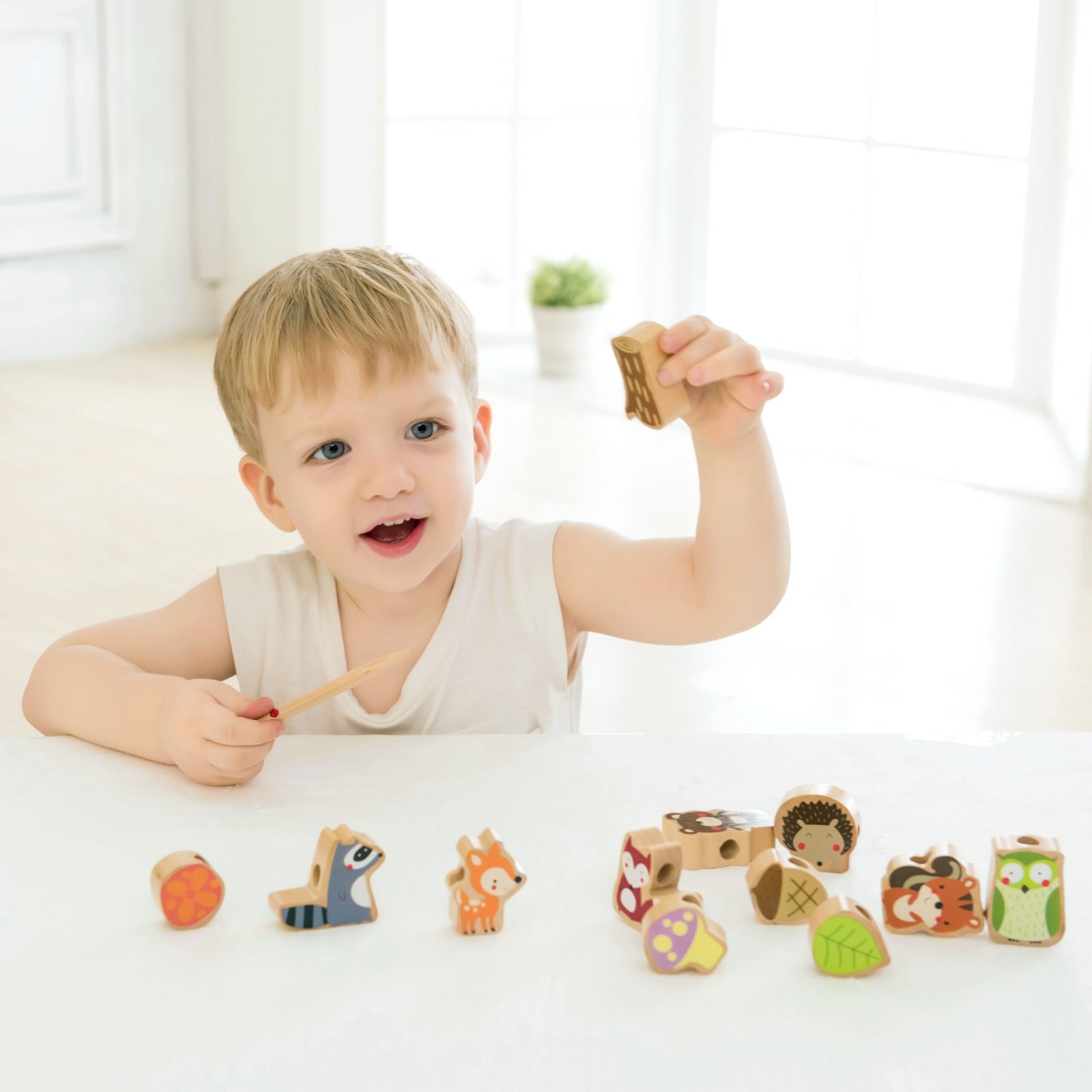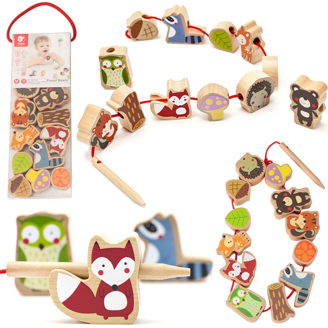 Šis medinis vėrimo rinkinys – lavinamasis žaislas, skirtas vaikams nuo 18 mėnesių. Rinkinį sudaro 13 miško gyvūnų ir augalų formų elementų, kuriuos mažylis gali verti ant virvelės, naudodamas medinę adatą.