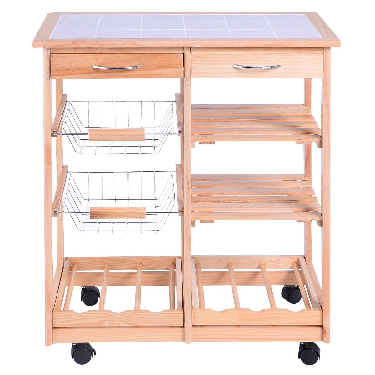Šis funkcionalus medinis virtuvės vežimėlis – puikus sprendimas, užtikrinantis papildomą erdvę ir patogumą Jūsų virtuvėje ar valgomajame. Dėl mobilios konstrukcijos ir didelės talpos jis taps nepakeičiamu kasdieniu pagalbininku. Pagamintas iš patvarios pušies medienos ir elegantiško plytelių stalviršio, vežimėlis puikiai derina estetiką ir praktiškumą.