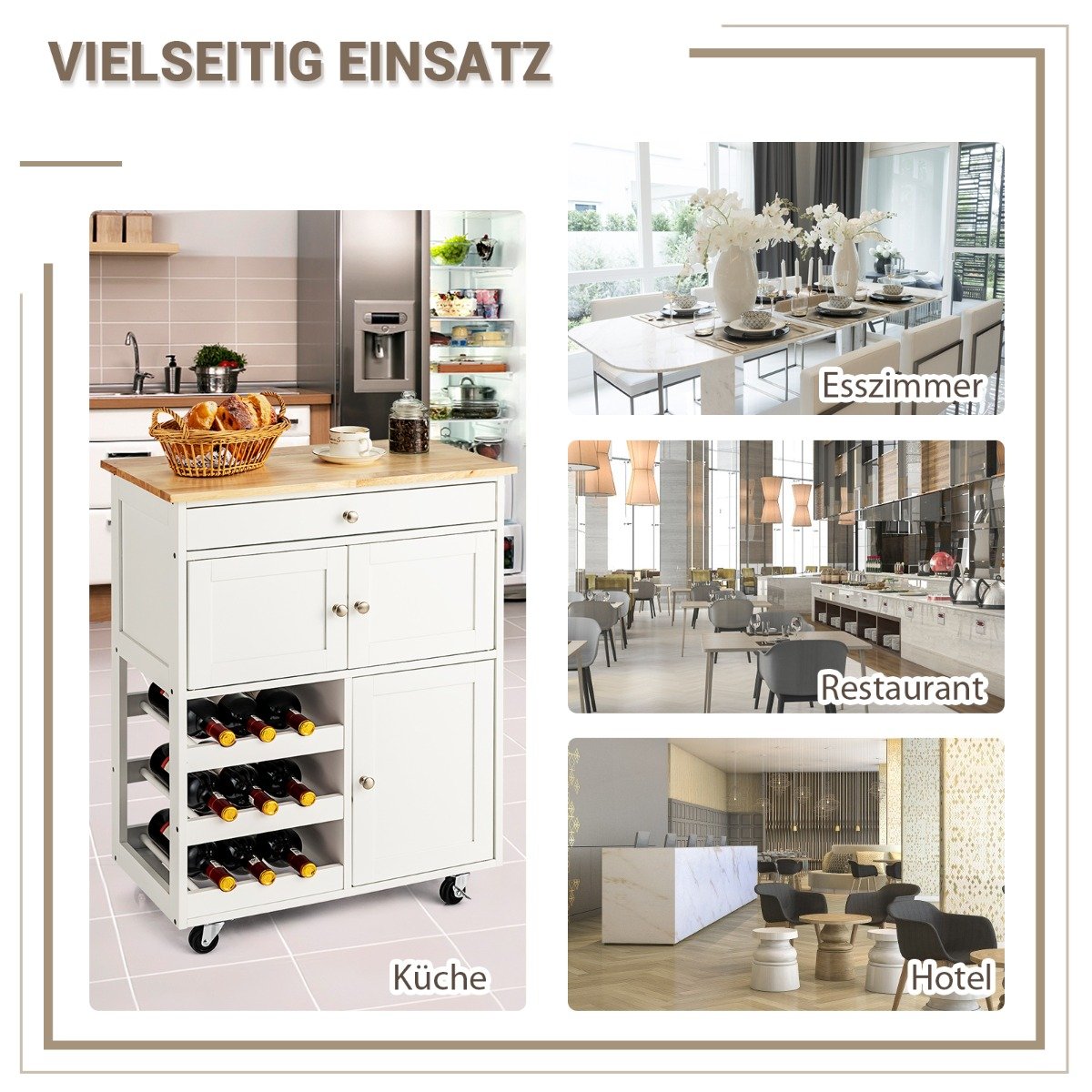 Šis elegantiškas medinis virtuvinis vežimėlis yra tvirtas ir ilgaamžis, siūlantis daug vietos įvairiems virtuvės reikmenims laikyti. Dėl savo funkcionalumo ir mobilios konstrukcijos jis puikiai tinka bet kuriai virtuvei ar valgomajam, padedantis palaikyti tvarką ir efektyvumą.