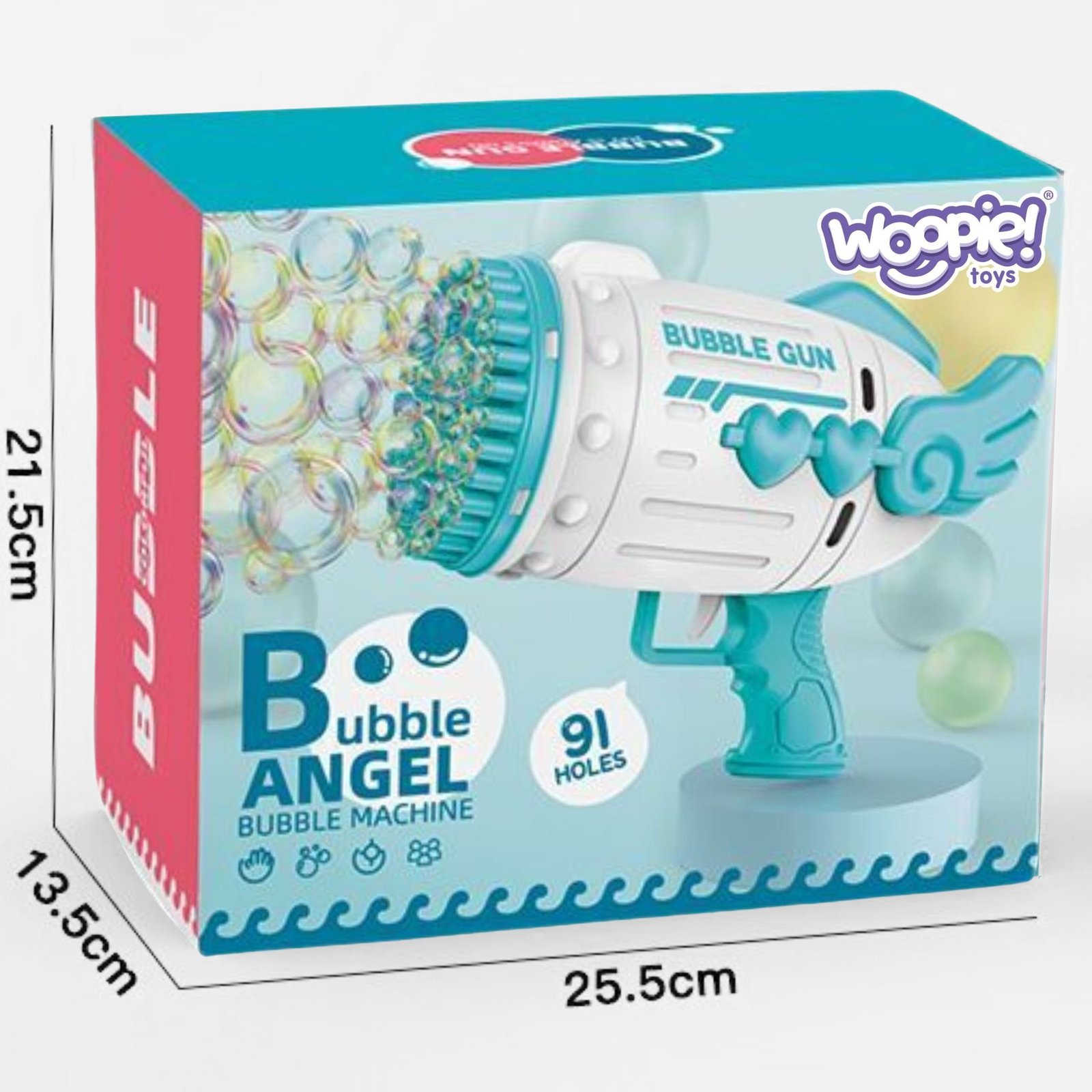 Pistoletas muilo burbulams – smagus žaislas vaikams. Su 91 anga, jis išpučia gausybę burbulų dideliu greičiu. Muilo burbulai – mėgstamiausia mažų ir didelių vaikų pramoga.