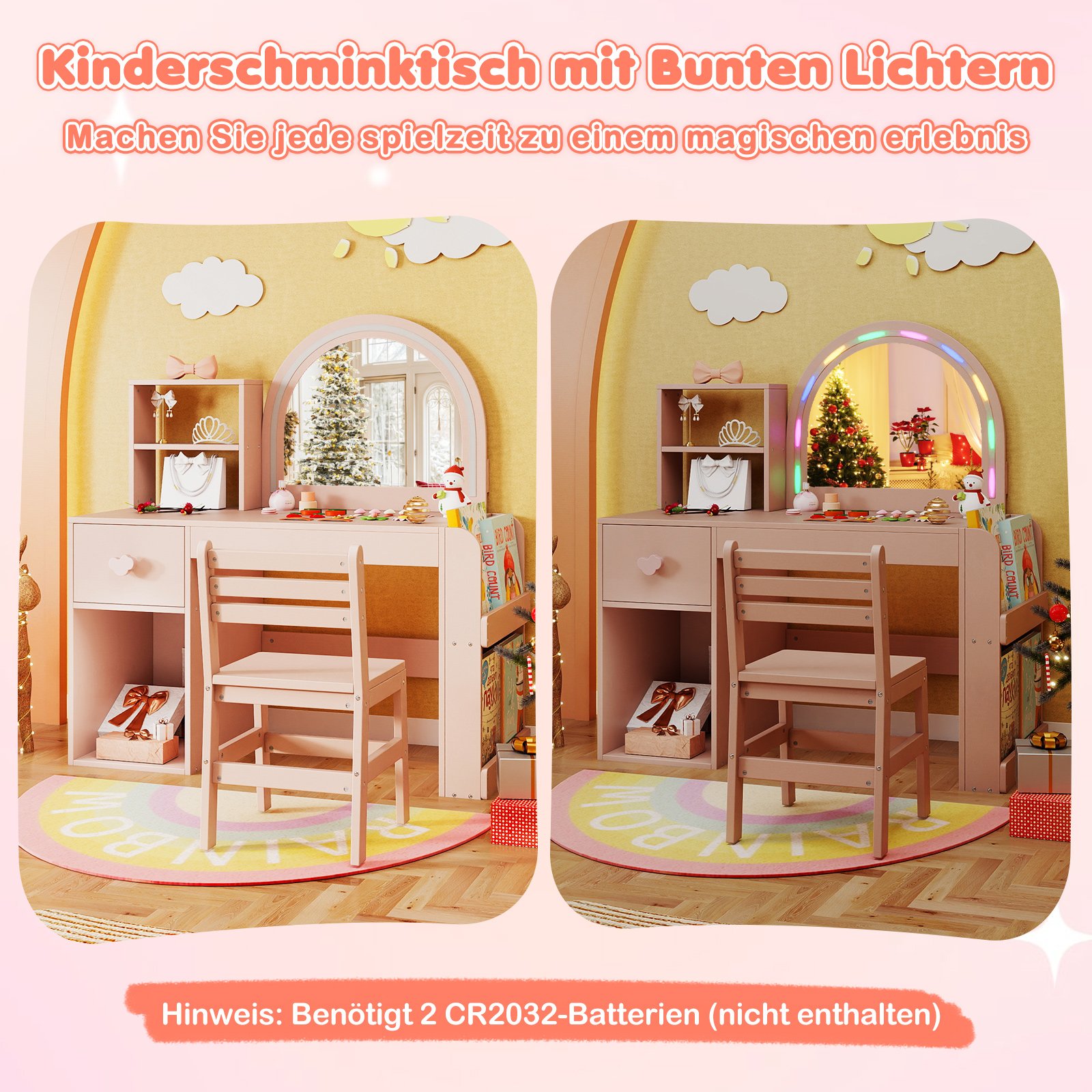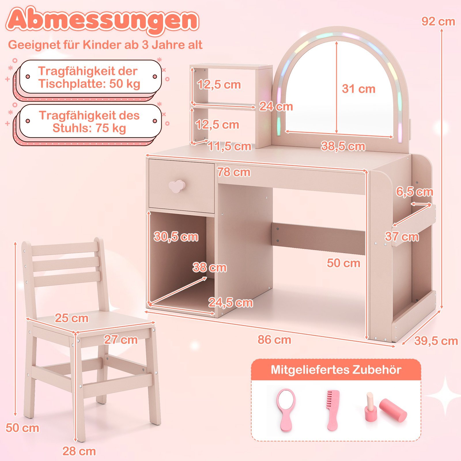 Su šiuo apšviestu kosmetiniu staliuku vaikams kiekviena žaidimo akimirka taps stebuklinga! Veidrodis, apšviestas spalvingomis lemputėmis, sukuria kerinčią erdvę persirenginėjimo žaidimams ir grožio rutinoms. Šis universalus rinkinys, derinantis funkcionalumą ir saugumą, yra puiki dovana, skatinanti vaizduotę ir kūrybiškumą.