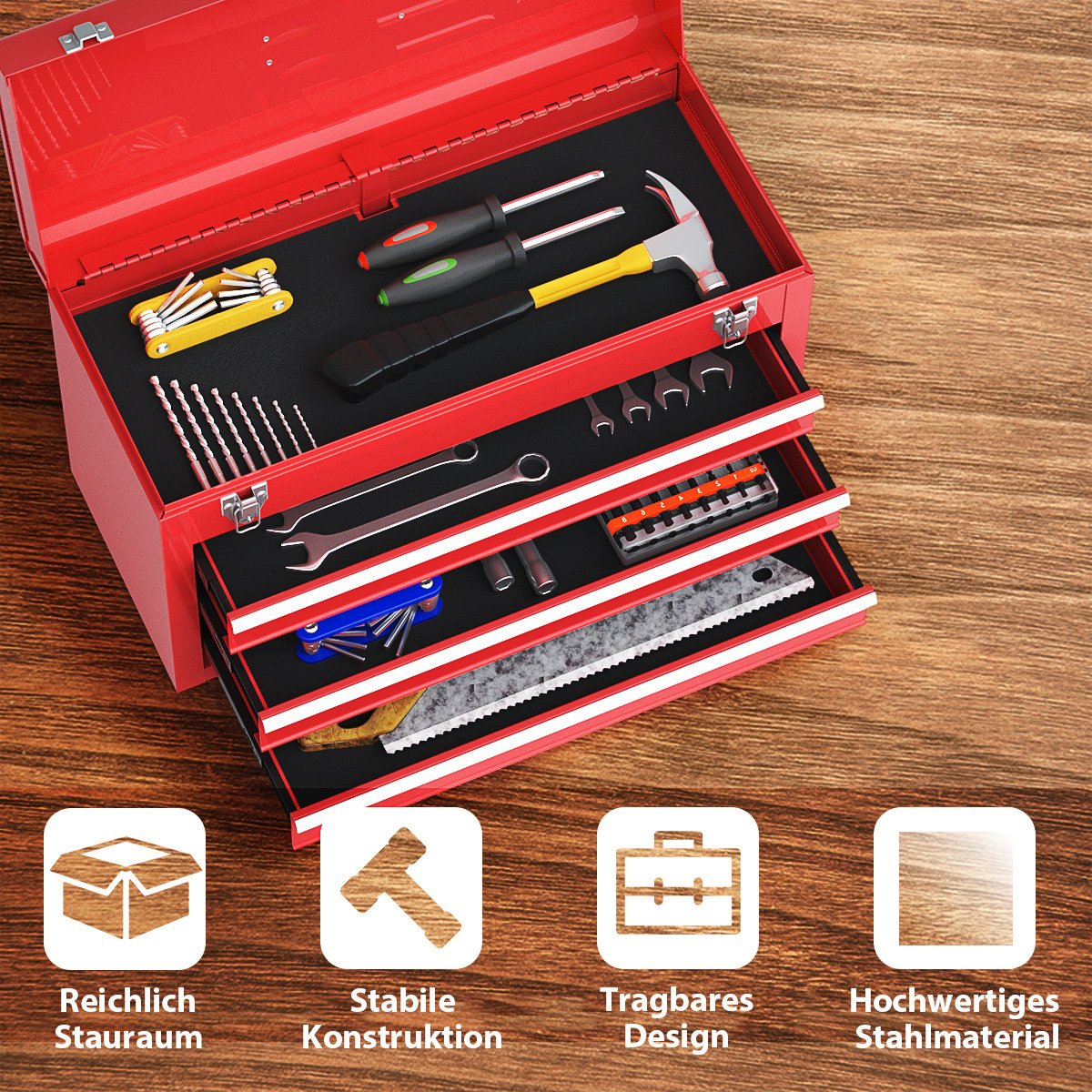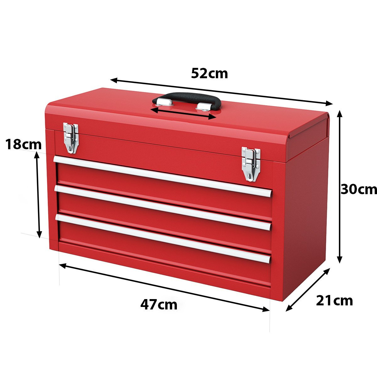 Metalinė įrankių dėžė su trimis stalčiais ir viršutine lentyna (Raudona)