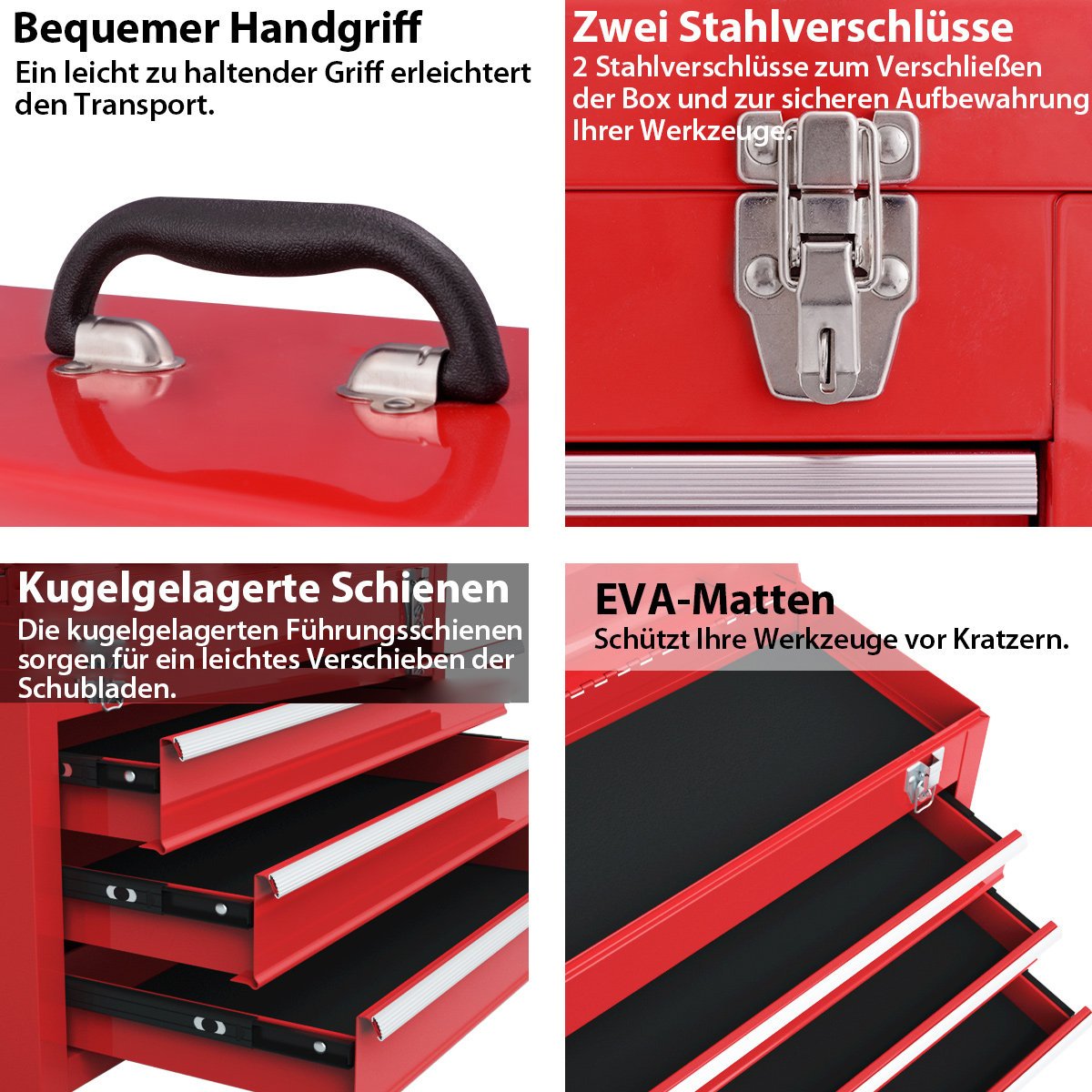 - Saugumas: dvigubi užraktai užtikrina, kad įrankiai neiškristų, o EVA putplasčio pamušalas apsaugo dėžės paviršių nuo įbrėžimų.