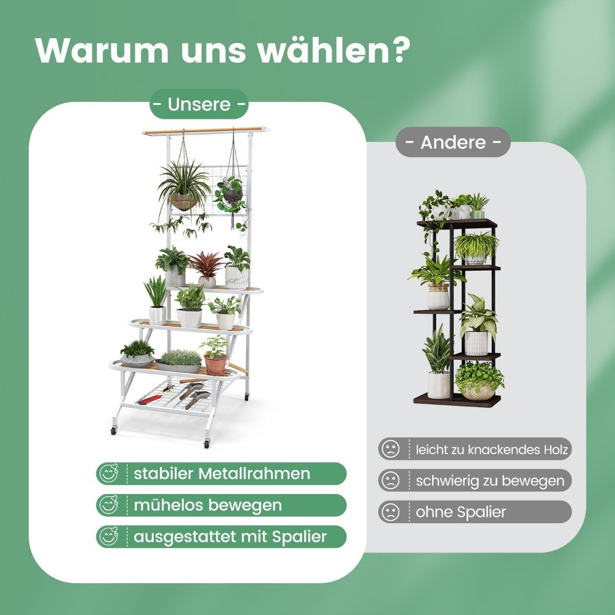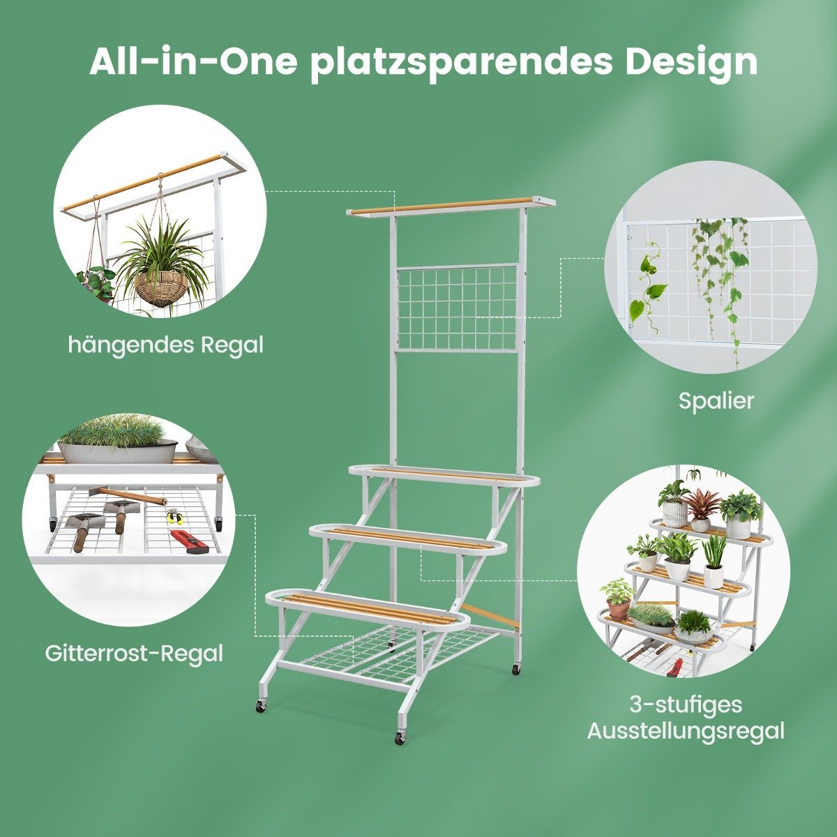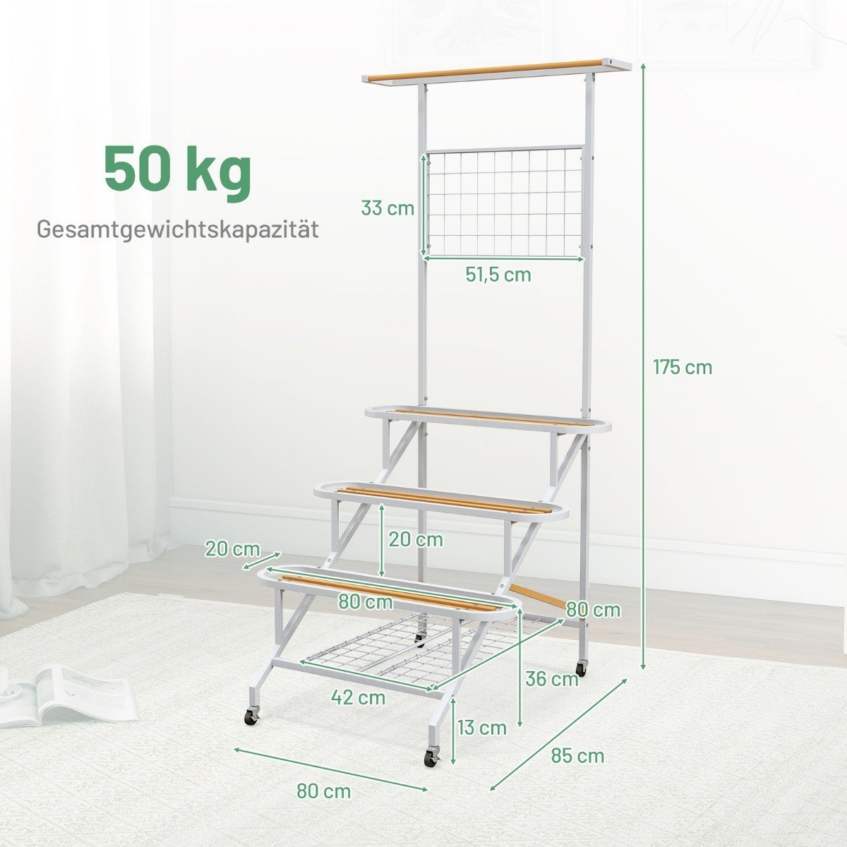 - Didelis 3 pakopų stovas su grotelėmis suteikia daug vietos augalams ir dekoracijoms.
